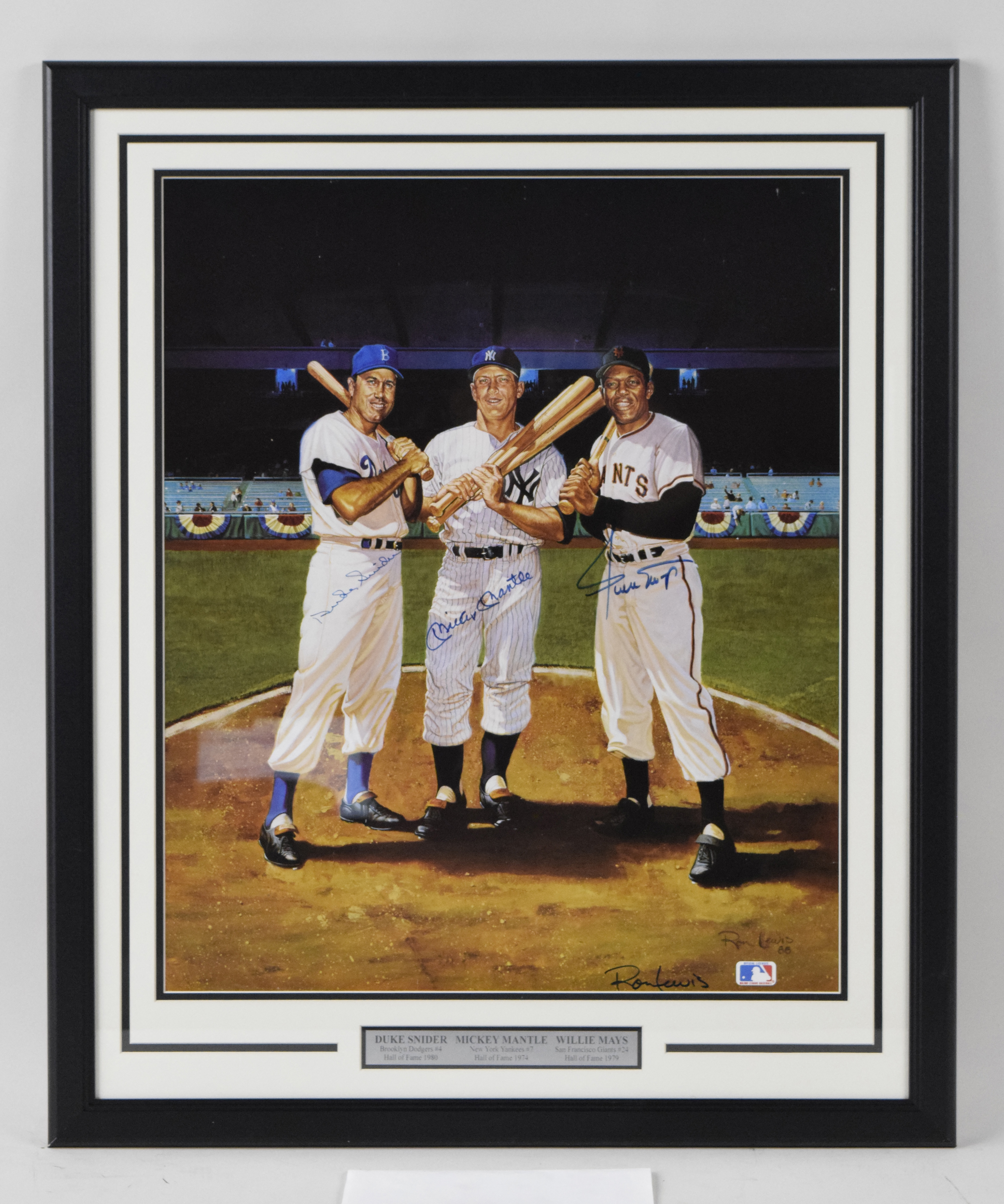Description:Mickey Mantle, Willie Mays, and Duke Snider multi-signed poster also signed by artist Ron Lewis - JSA (NM framed). Frame measures approx. 26""x31"". Willie, Mickey, and The Duke each signed the photo in blue marker (along with Ron Lewis). Signatures rate 9 to 10 out of 10. Includes full LOA from JSA. Due to framing, complete condition is unknown: NM appearance ($500-$750)