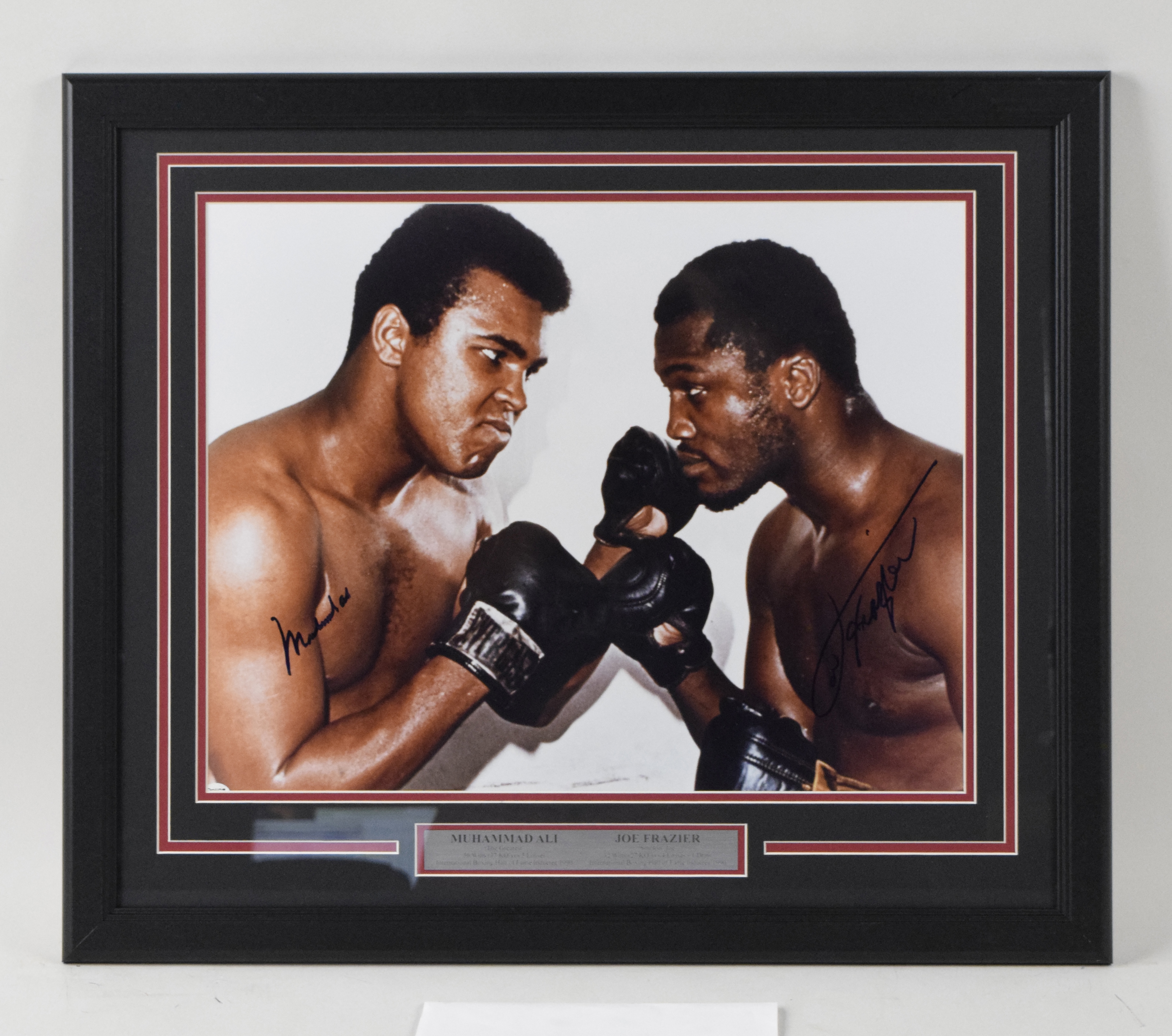 Description:Muhammad Ali and Joe Frazier dual-signed oversize framed photograph (NM). Frame measures approx. 22""x26"" (horizontal). Frazier and Ali both signed the photo in black marker. Signatures rate 9 to 10 out of 10. Due to framing, complete condition is unknown: NM appearance ($500-$750)
