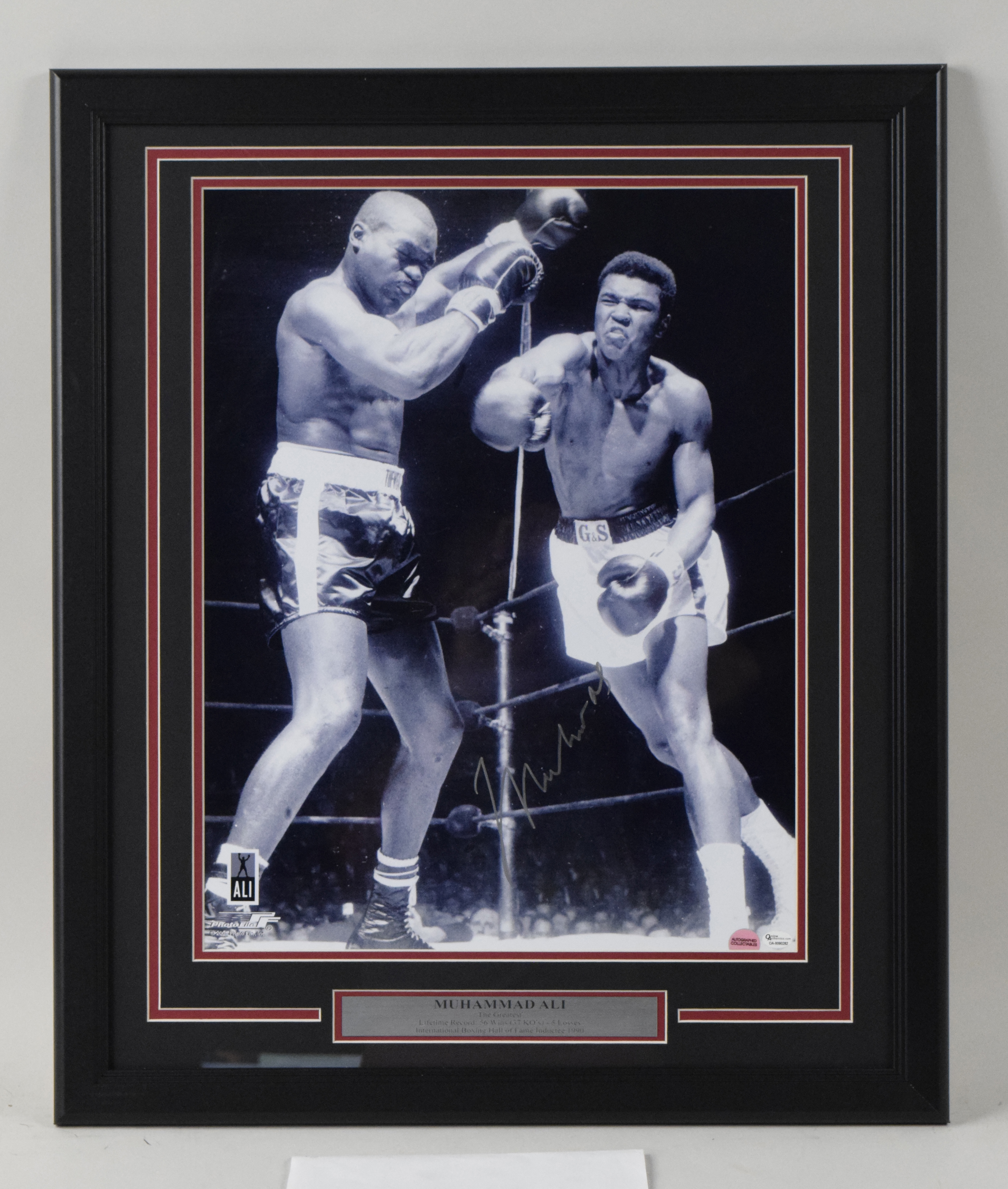 Description:Muhammad Ali autographed oversize framed photograph (NM). Approx. 22""x26"" vertical framed photo picturing Ali punching Sonny Liston. Ali signed the photo in silver marker. Signature rates 9/10 out of 10. Online Authentics serial #ed sticker is on the photo. Due to framing, complete condition is unknown: NM appearance ($500-$750)