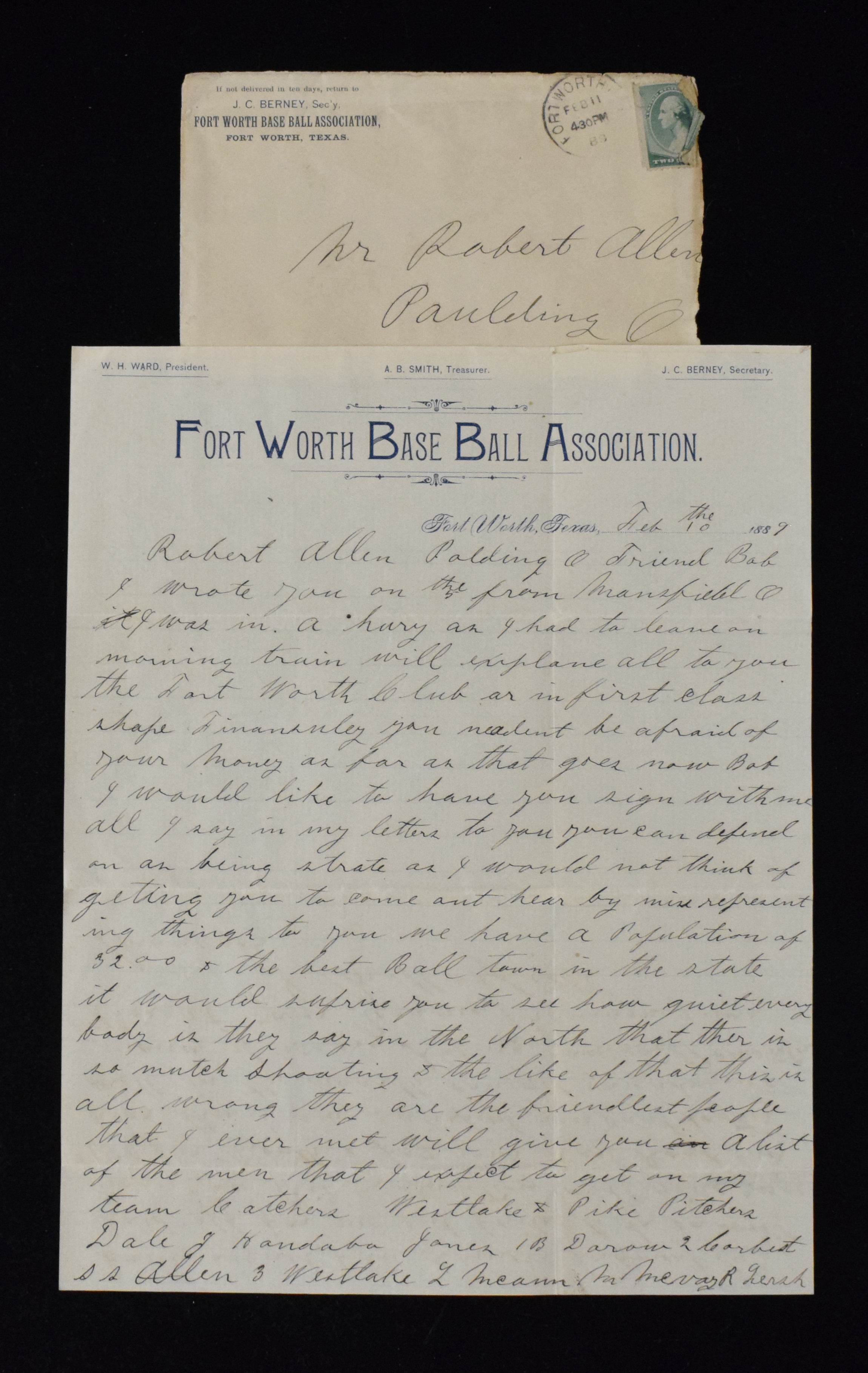 Description:1889 handwritten letter signed by Fort Worth Panthers manager James Horsfield on team stationery with original envelope (EX). Lengthy letter dated 2/10/1889 covering the entire front and 1/3 of the back which was sent to a potential player named Robert Allen discussing his desire to have him come play for the team. Horsfield wrote and signed the letter in vintage fountain pen. Signature rates 8 out of 10. Only light wear with normal fold creases, and includes the original mailing envelope: EX ($500-$1,000)