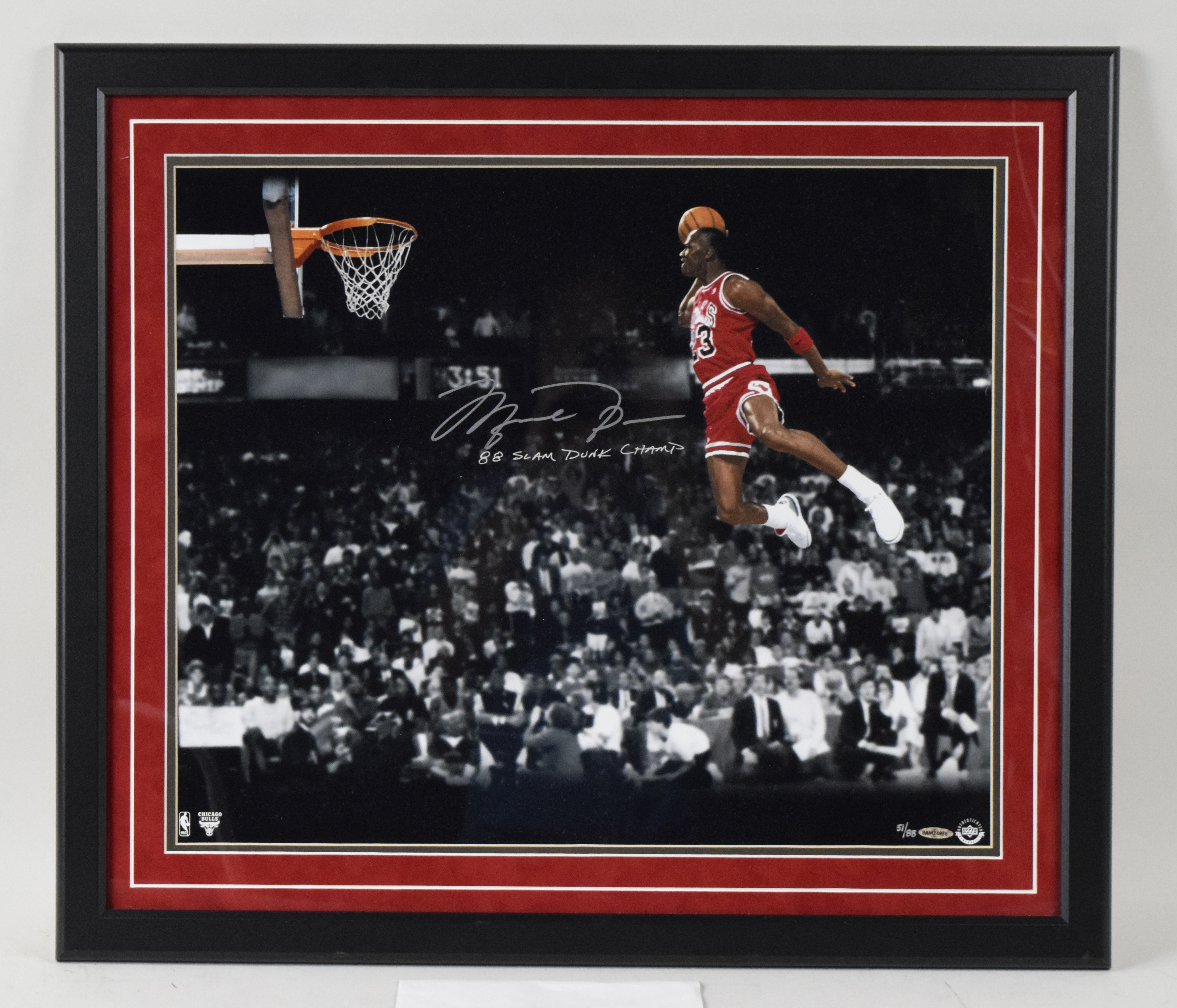 Description:Michael Jordan autographed limited edition oversize framed "88 Slam Dunk Champ"" photo - UDA (NM/MT). Frame measures approx. 26.5""x30"". Jordan signed the photo in silver marker. Signature rates 9/10 out of 10. The photo is numbered 51/88. Includes COA from Upper Deck Authenticated (matching serial #ed hologram sticker is on the photo). Due to framing, complete condition is unknown: NM/MT appearance ($1,500-$3,000)