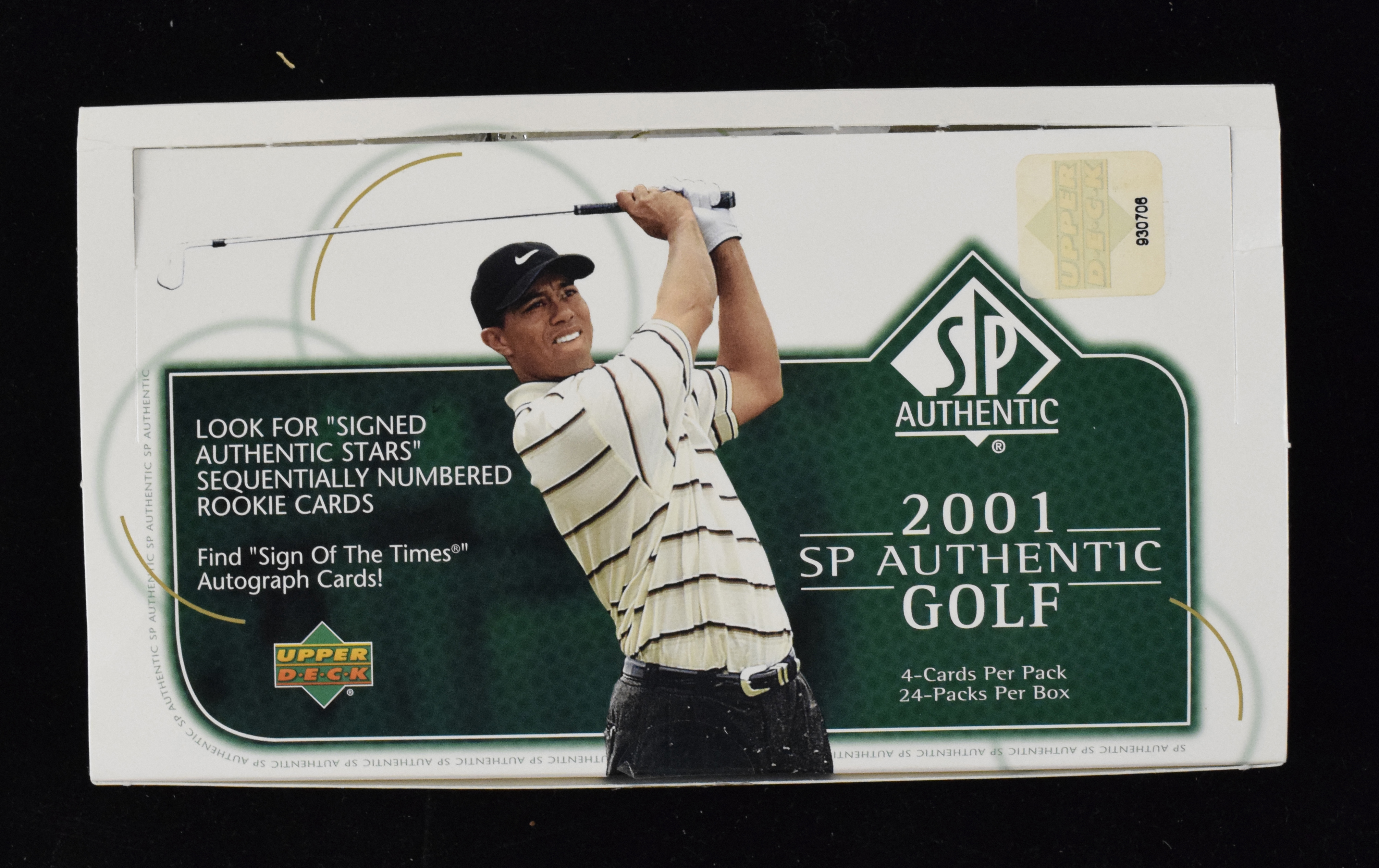 Description: 2001 SP Authentic Golf open hobby box with (24) foil packs, Tiger Woods auto RC possible (Packs: NM/MT). Box is open on top, and inside are (24) unopened foil packs of (4) cards each. Desirable packs offer a chance at the key autographed rookie card of superstar Tiger Woods, numbered to 900. Packs: NM/MT. ($500-$1,000)