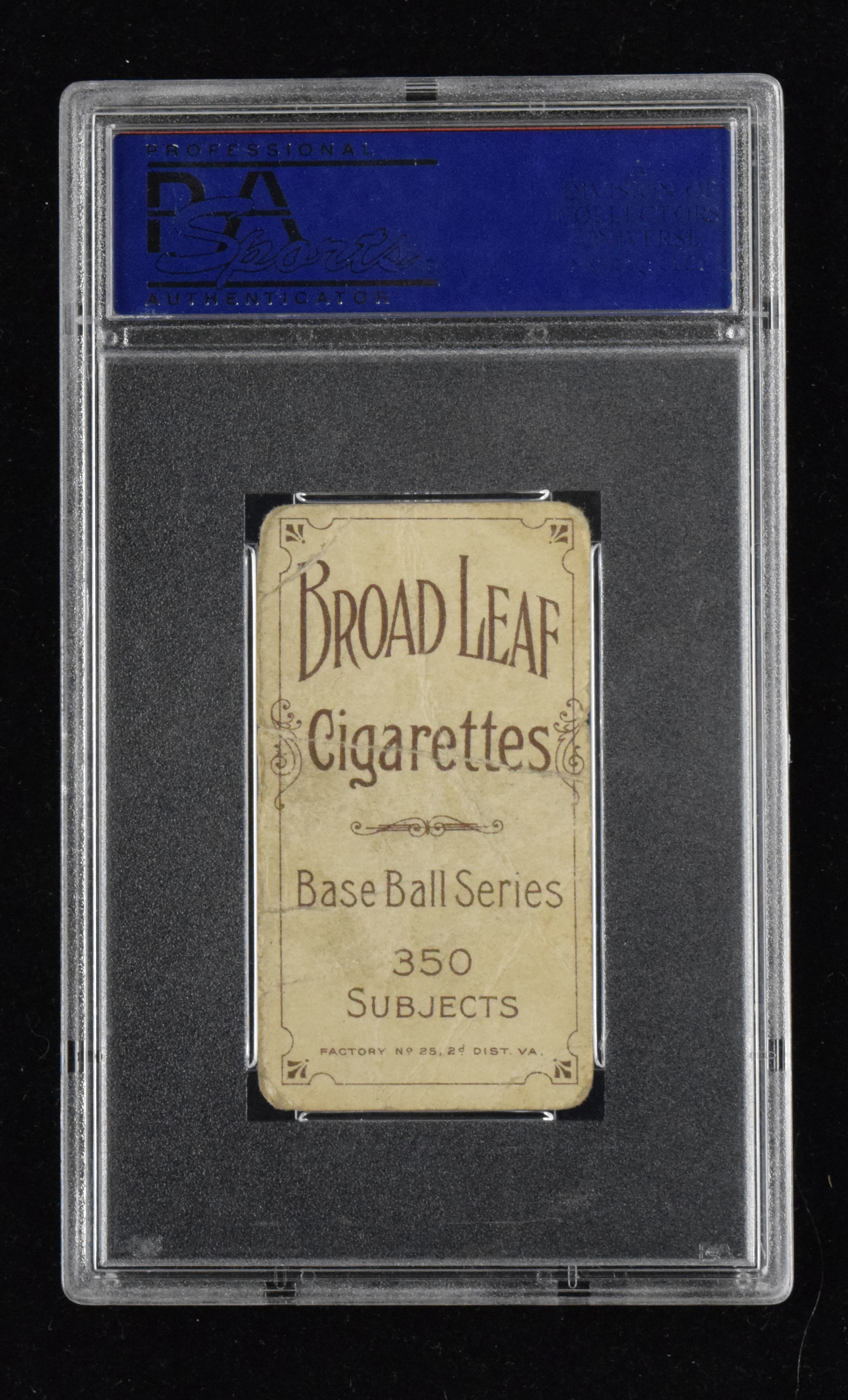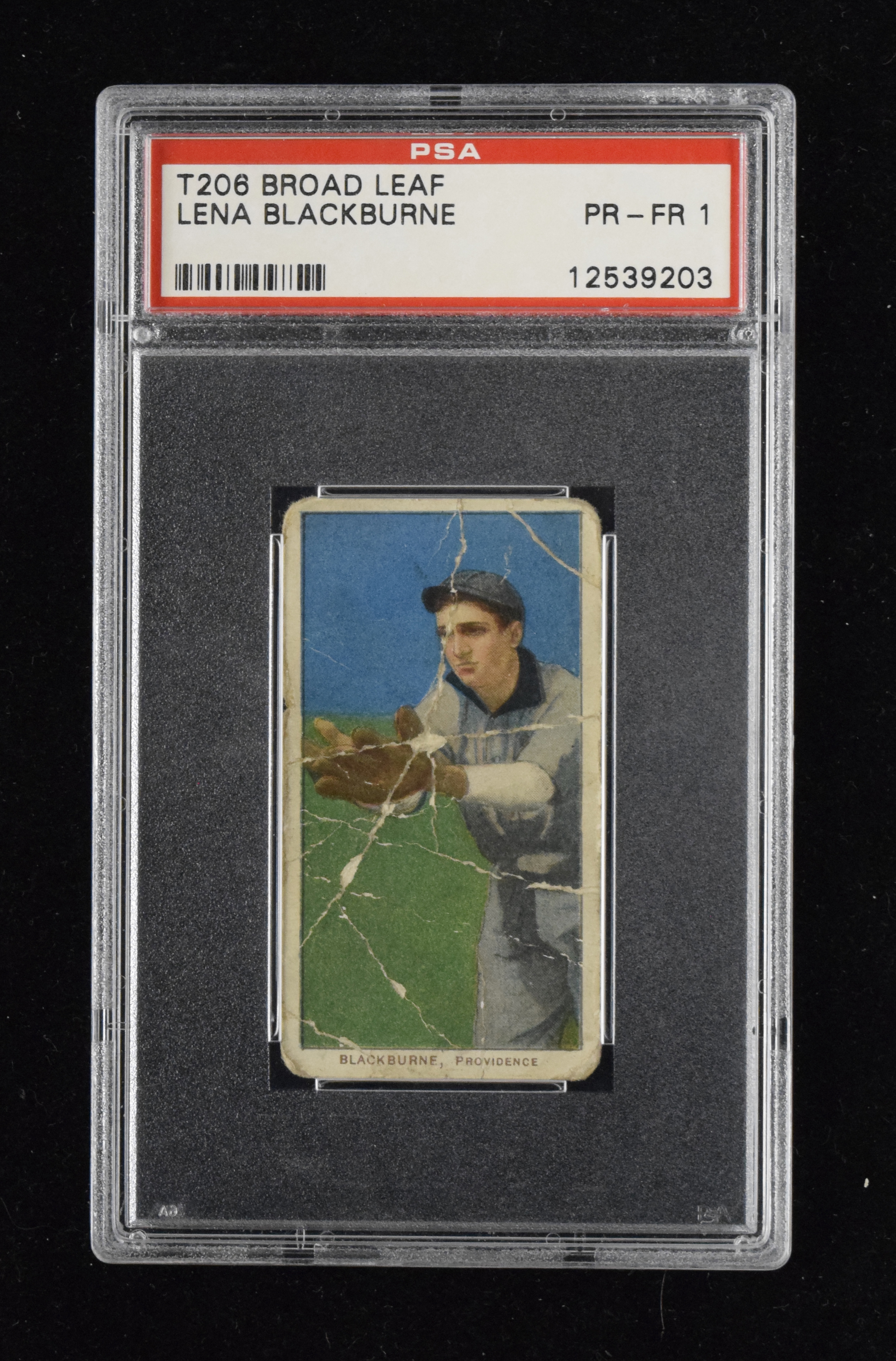 Description:1909-11 T206 Lena Blackburne with rare Broad Leaf 350 back (PSA 1 PR). Low-grade copy exhibits numerous heavy creases that criss-cross the front, as well as four well-rounded corners and edge wear. Card exhibits one of the tougher T206 back variations: Broad Leaf 350, which is comparatively clean though creasing and light staining are visible: PSA 1 PR. ($500-$1,000)