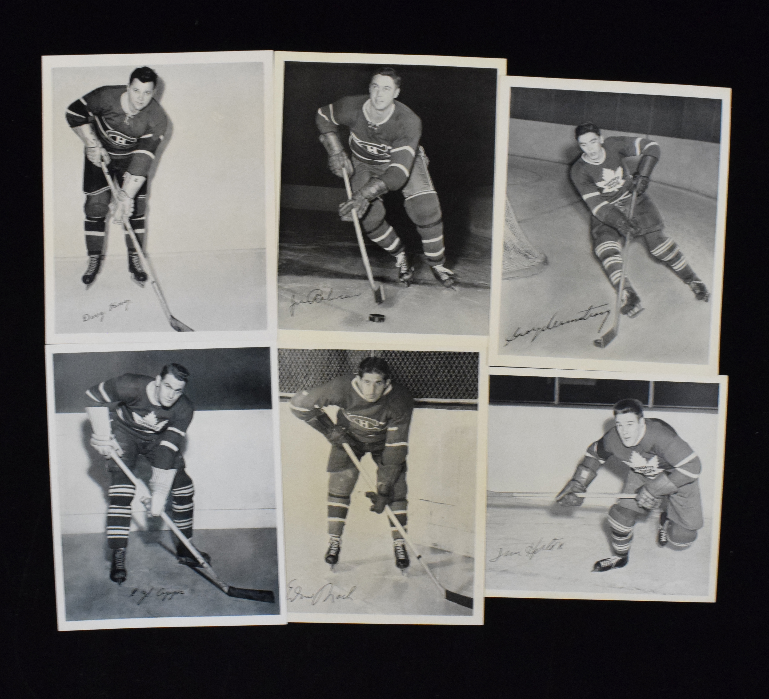 Description:Lot of (200+) 1945-54 Quaker Oats hockey premiums with Canadiens & Maple Leafs near-complete sets (PR-EX/MT). Obscure, 8"x10" paper-thin premiums were issued over a 9-year period by Quaker Oats, making complete and near-complete sets very tough to find today. Lot includes (99) Toronto Maple Leafs premiums and (102) Montreal Canadiens premiums (including Stanley cup multi-player) with most player photo variations from both teams present. There appears to light duplication in the lot. Hall of Famers include (2) Jean Beliveau, (4) Elmer Lach, (2) Doug Harvey, (4) Emile Bouchard, (3) Toe Blake, (3) Syl Apps, (1) George Armstrong, (3) Max Bentley, (3) Turk Broda, (1) Tim Horton, (4) Ted Kennedy, (3) Harry Watson and more. All are housed in pages and two binders. Most appear VG/EX due to light wrinkles, folds or creasing, though nearly all retain excellent eye appeal. Range: PR-EX/MT (including a few with writing on the reverse). ($1,000-$2,000)
