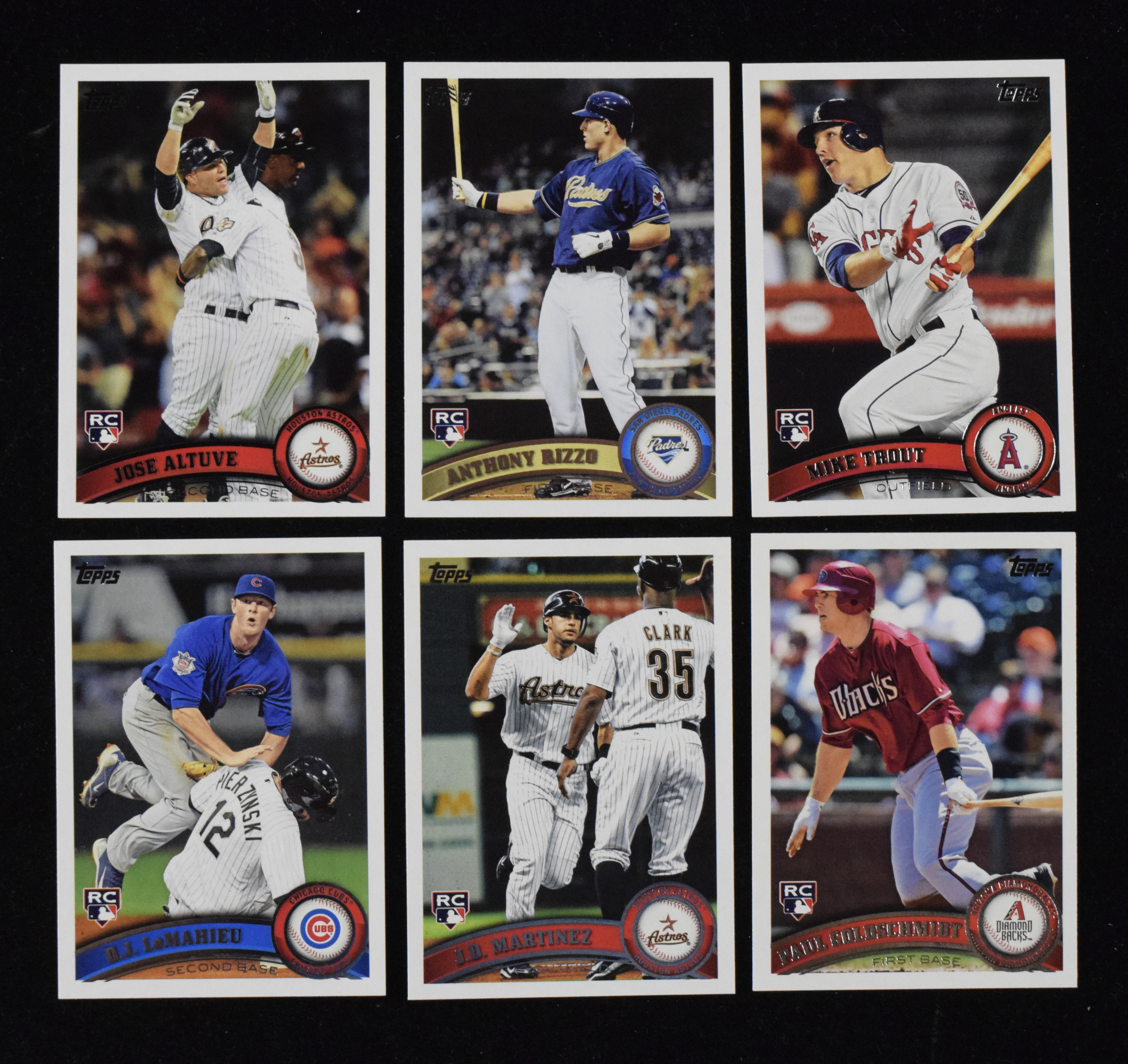 Description:Pack-fresh 2011 Topps and Update complete/near-complete sets with Mike Trout RC (MT). Very high-grade 2011 Topps base and 2011 Topps Update cards are housed in pages and a binder in team order, appearing to comprise complete sets but are not guaranteed as such due to the team collation. All major rookies from the Update set are present, including #s US175 Mike Trout, US132 Jose Altuve, US205 D.J. LeMahieu, US 47 Paul Goldschmidt, US186 J.D. Martinez and US55 Anthony Rizzo, along with what appears to be a complete 2011 Topps base set. Cards appear MT or better. ($500-$1,000)