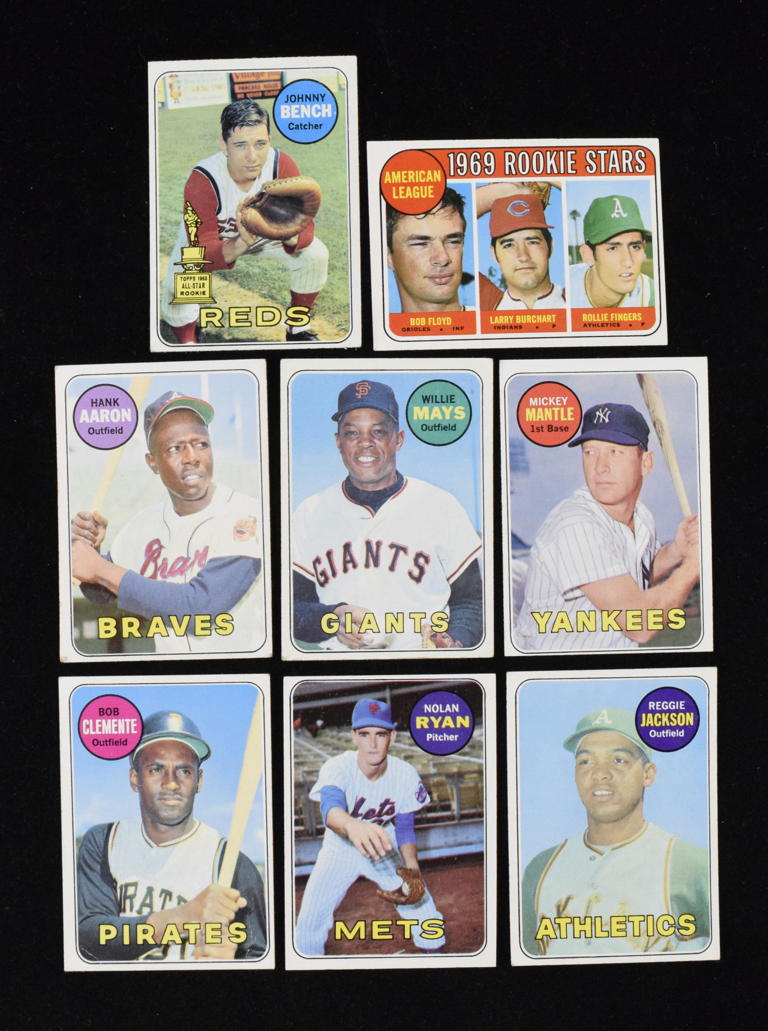 Description:1969 Topps complete set (664) with Reggie Jackson RC (PR-EX/MT). Mostly lower-grade complete set of (664) different cards is highlighted by the last playing-era card of Mickey Mantle (#500 yellow name (VG/EX OC), as well as the rookie cards of Reggie Jackson (#260; VG/EX) and Rollie Fingers (#597 EX OC). Other key cards include #s 50 Roberto Clemente (GD), 95 Johnny Bench (FR), 100 Hank Aaron (FR), 120 Pete Rose (VG/EX), 190 Willie Mays (VG), 480 Tom Seaver (VG/EX) and 533 Nolan Ryan (EX/MT OC) and numerous other Hall of Famers. Balance of the set appears mostly VG/EX with some better and some worse. Range: PR-EX/MT (including a few with writing). ($1,000-$1,500)