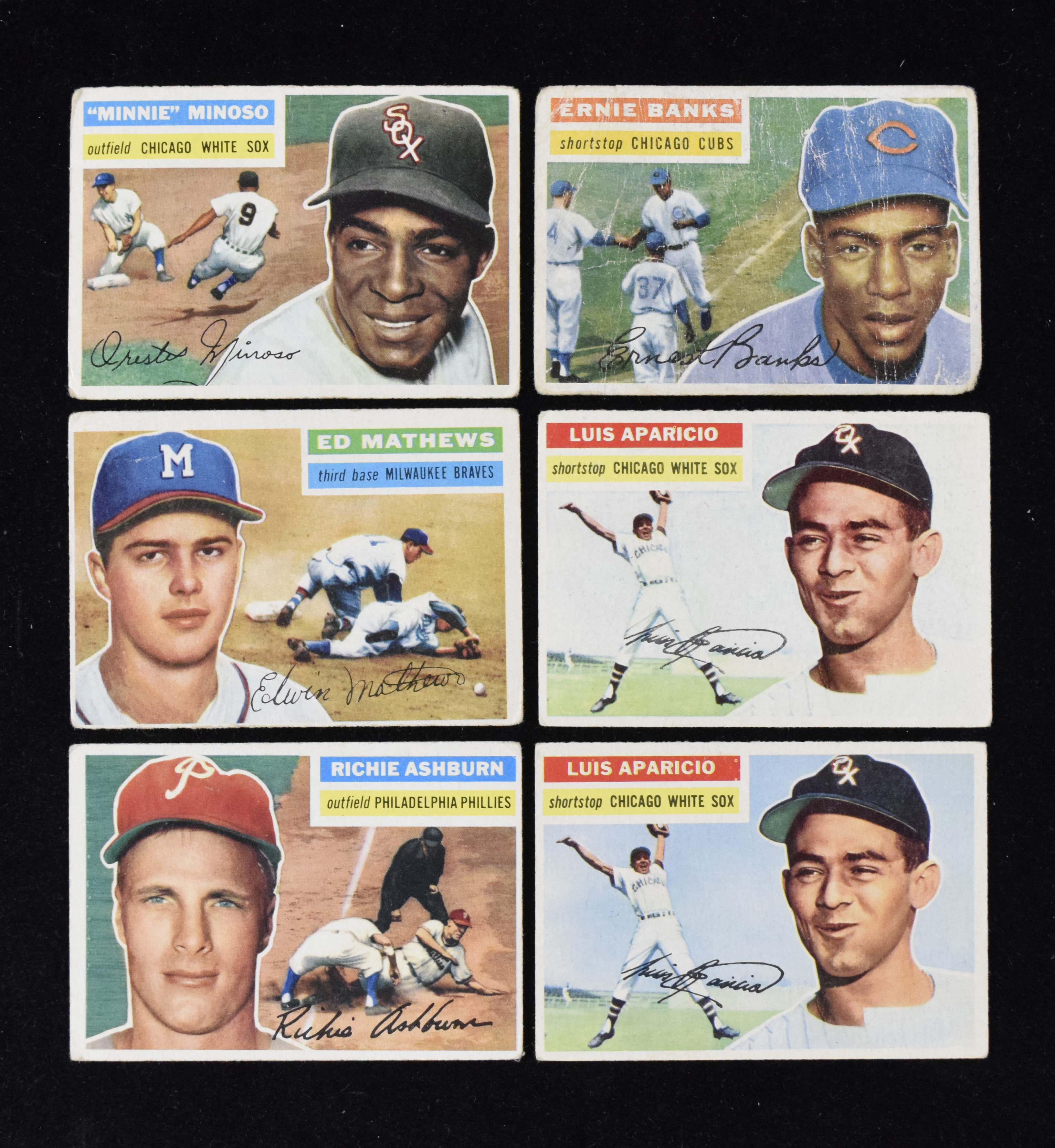 Description:Lot of approx. (250) 1956 Topps cards with HOFers, including Banks, (2) Aparicio RC (PR-VG/EX). Good quantity of 1956 Topps cards (with duplication) includes mostly commons and minor stars, with some Hall of Famers sprinkled around. Highlights include #s 15 Ernie Banks white back (PR), 120 Richie Ashburn gray back (VG), (2) 292 Luis Aparicio RC (GD & VG), 195 George Kell (GD), 107 Eddie Mathews gray back (GD) and 125 Minnie Minoso gray back (GD). Balance of the lot, with a mixture of gray and white backs appears mostly GD-VG with some better and some worse. Range: PR-VG/EX. ($500-$750)