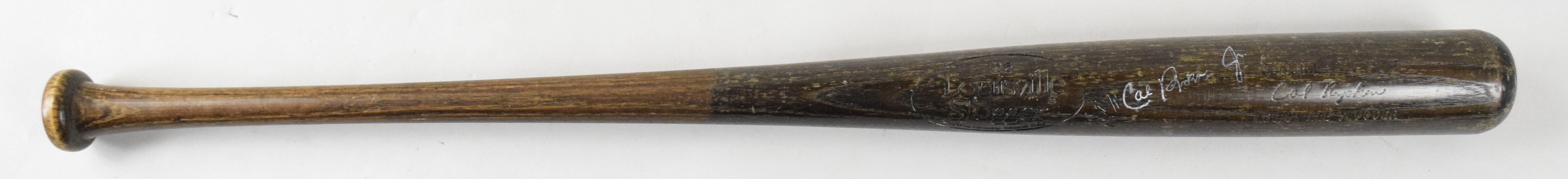 Description:Cal Ripken Jr. autographed pro stock baseball bat, c. 1983-85 (EX; see description). 34" Louisville Slugger model P72 pro stock bat has been signed by Cal Ripken Jr. in silver marker on the barrel but has been traced over/enhanced. Bat weights 31.5 ounces and Ripken's number "8" is written on the knob end. Bat has evidence of light use and has an "SCD Authentic" sticker on the barrel end, though it is strictly a pro stock bat only: EX. Includes previous auction LOA from PSA/DNA (autograph only/traced). ($500-$1,000)
