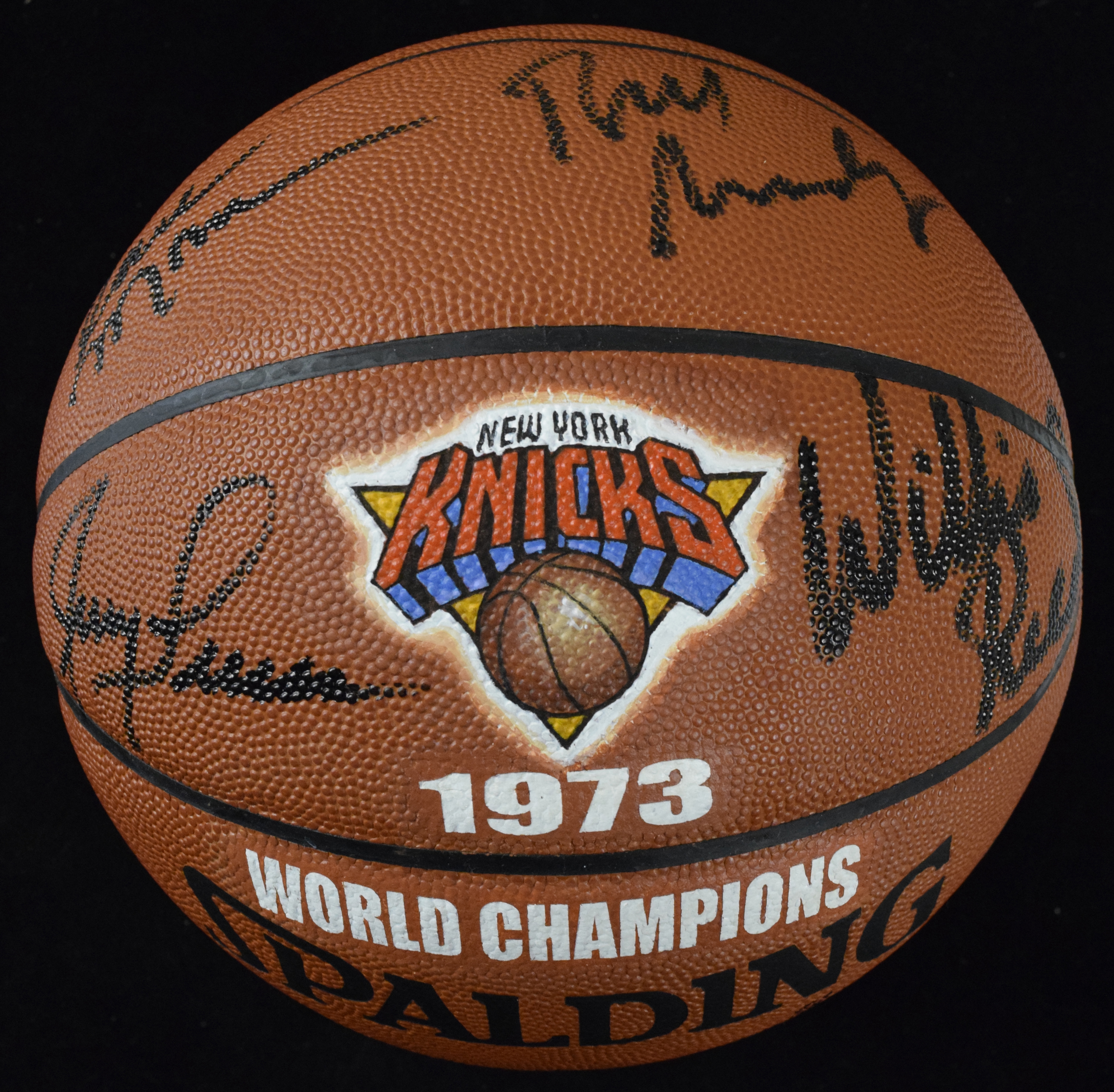 Description:Very nice 1973 N.Y. Knicks World Champions team-signed basketball with (7) HOFers (Sigs. NM/MT-MT). Spalding New York Knicks 1973 World Champions logo basketball has been signed by (8) members of the championship winning team (seven of whom are in the Hall of Fame): Earl Monroe, Bill Bradley, Jerry Lucas, Willis Reed, Walt Frazier, Dick Barnett, Dave DeBusschere and Henry Bibby. Signatures rate 8/9 out of 10. Basketball, numbered 5/10, is lightly deflated (EX/MT), and comes in an attractive "1973 Knicks" plastic display case. ($500-$1,000)