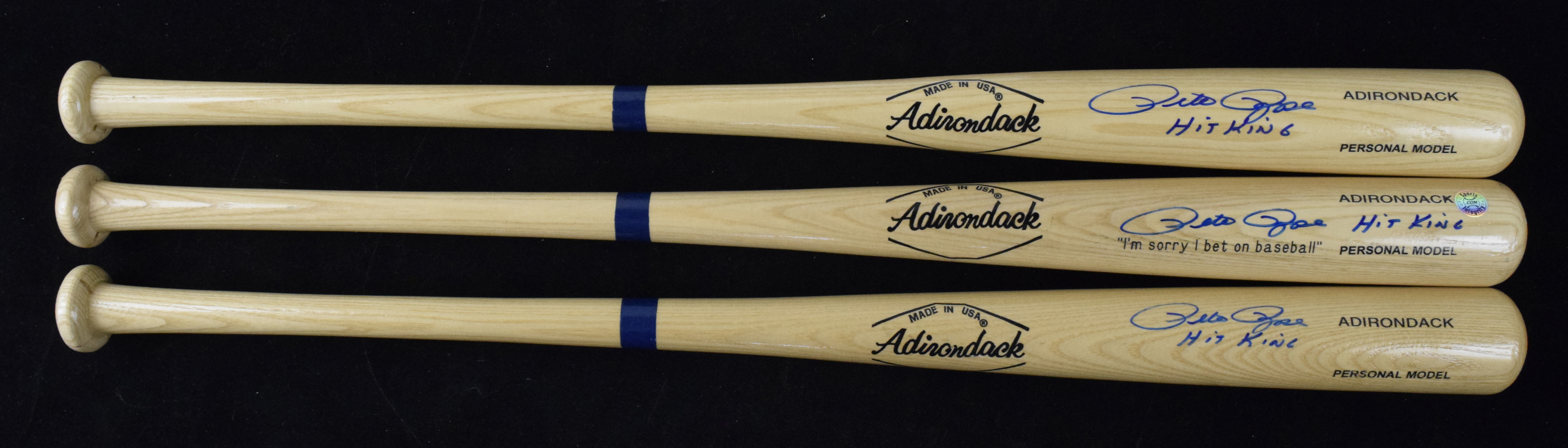 Description:Lot of (5) Pete Rose signed and "Hit King" inscribed baseball bats with JSA, PSA/DNA certs (Sigs. NM/MT-MT). Nice lot of like-new 34" Adirondack personal model bats, with each signed on the barrel by Pete Rose with "Hit King" inscriptions, rating 8/9 out of 10. Two bats are also engraved on the barrel "I'm sorry I bet on baseball" and have JSA authentication stickers affixed to the knob ends. The other three have PSA/DNA authentication stickers affixed to either the knob or barrel ends. JSA and PSA/DNA basic certs for all five bats are also included. Bats have little to no wear: NM/MT. ($500-$750)