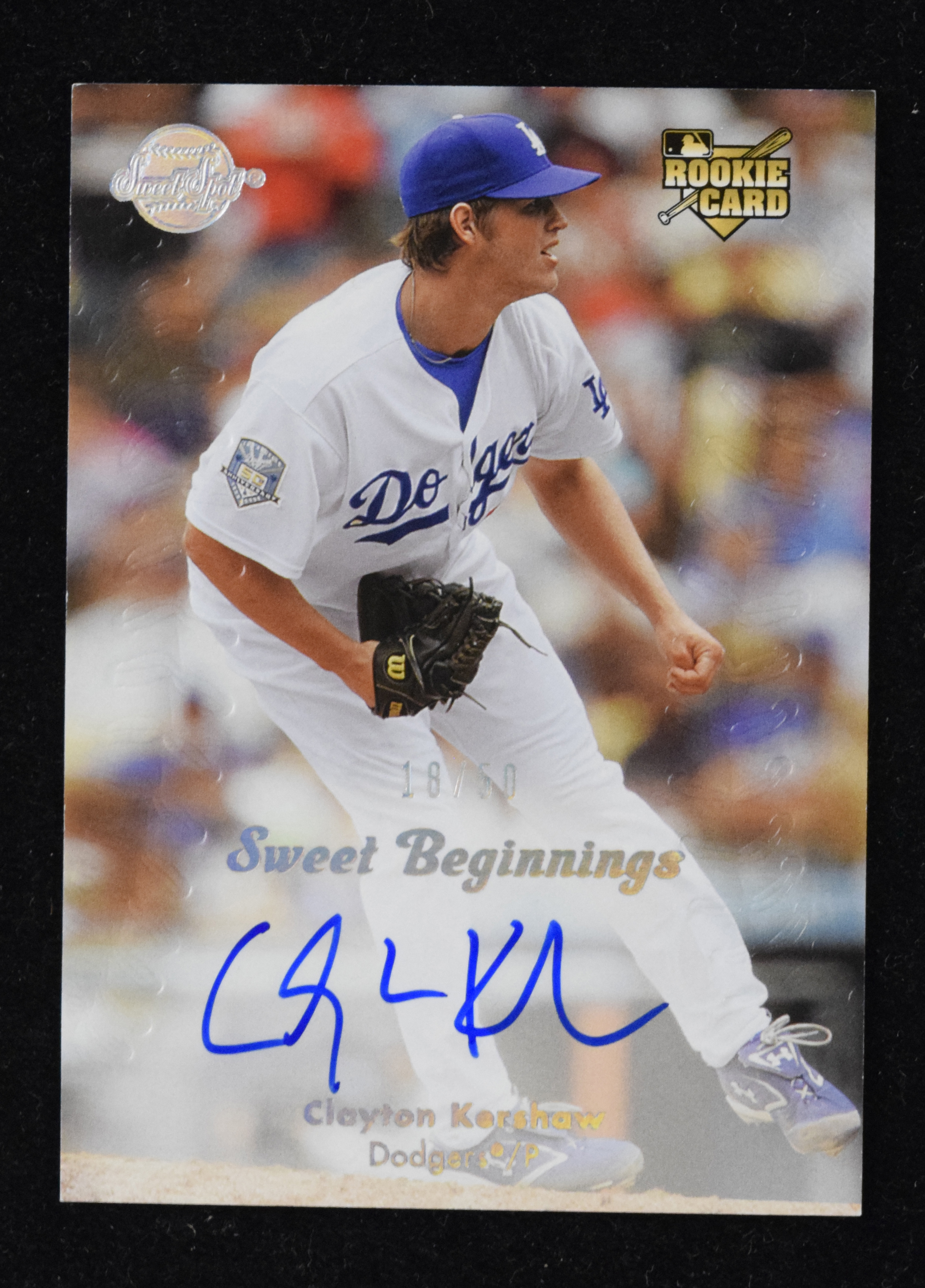 Description:2008 Upper Deck Sweet Spot Signatures 50 (18/50) Clayton Kershaw autographed RC (Card: NM; Auto: MT). Scarce #133 rookie card is signed on the front by Clayton Kershaw in blue marker, rating 9/10 out of 10. Card, which is numbered 18/50 on the front, has very slight touches of wear to a couple of corners. Front and back surfaces are clean. Card: NM; Auto: MT. ($750-$1,250)