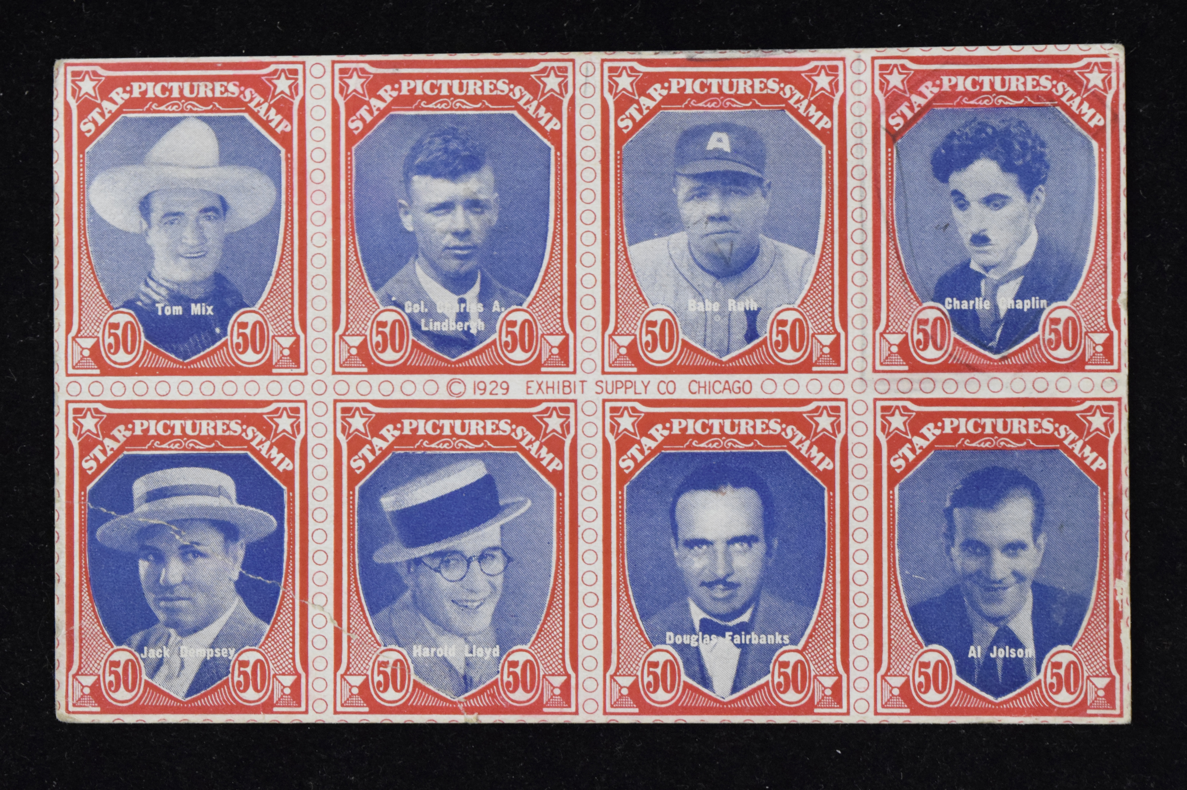 Description:1929 Exhibits "Star Picture Stamps" postcard with Babe Ruth, Jack Dempsey and Charlie Chaplin (PR; mailed). Interesting Exhibit card was produced in 1929 to promote sports legends, Hollywood film stars and other icons of the time. Card features stamp-size photos of Babe Ruth (from the 1927 film "The Babe Comes Home," Jack Dempsey, Tom Mix, Charlie Chaplin, Harold Lloyd, Douglas Fairbanks, Al Jolson and Charles Lindbergh. Card has a heavy crease in the lower left, and postcard reverse has been addressed with correspondence in pencil, stamped, postmarked (in 1939) and mailed: PR. ($500-$1,000)