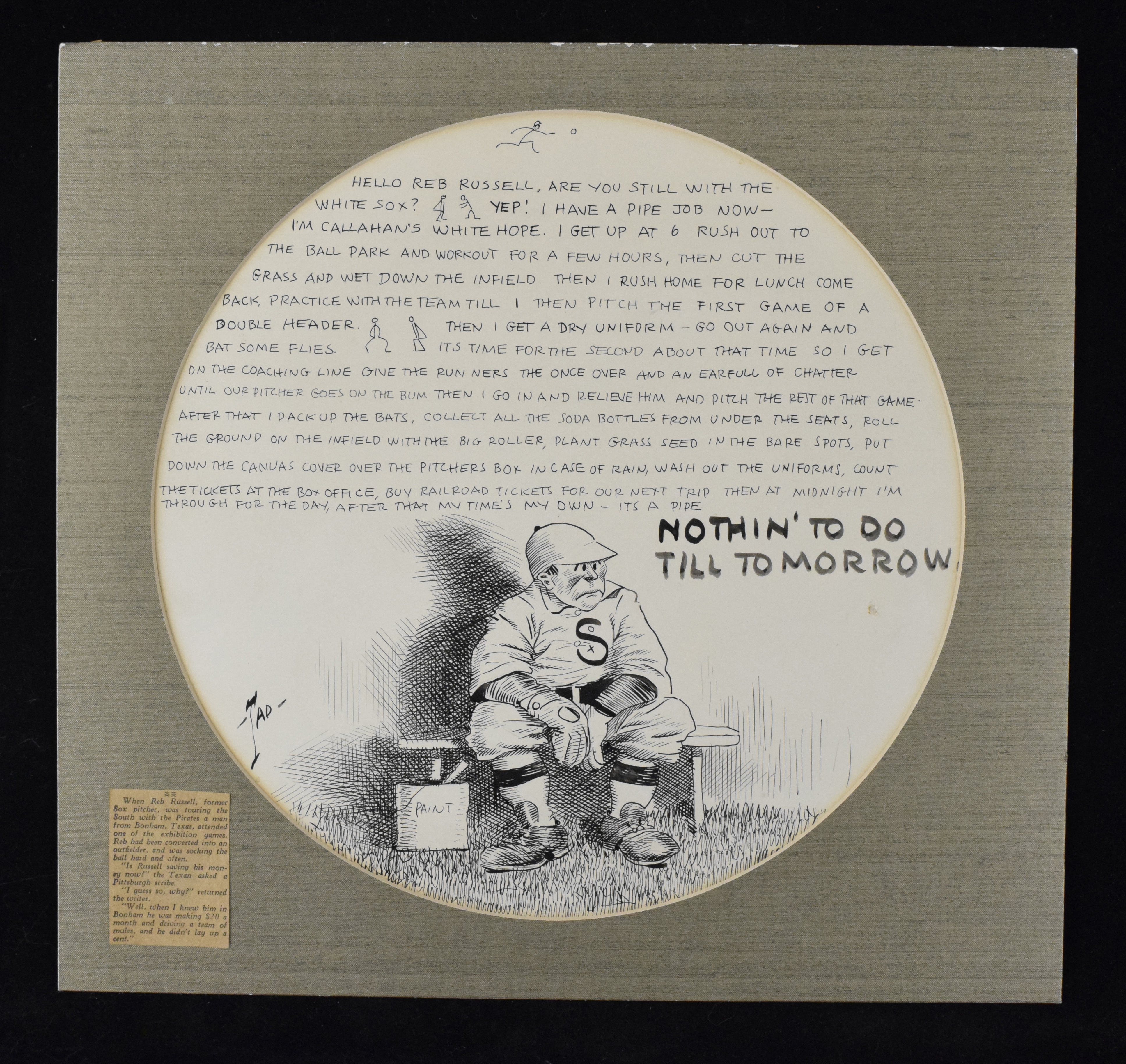 Description:Reb Russell original cartoon artwork signed by Tad Dorgan, c.1913-14 (EX/MT matted). Matting measures approx. 16"x17". Lengthly text notes a humorous list of jobs Russell does for the White Sox and manager Jimmy Callahan, with an drawing below of Russell sitting on a bench. Signed "TAD" by cartoonist Tad Dotgan (d.1929 at age 52): EX/MT ($300-$500)