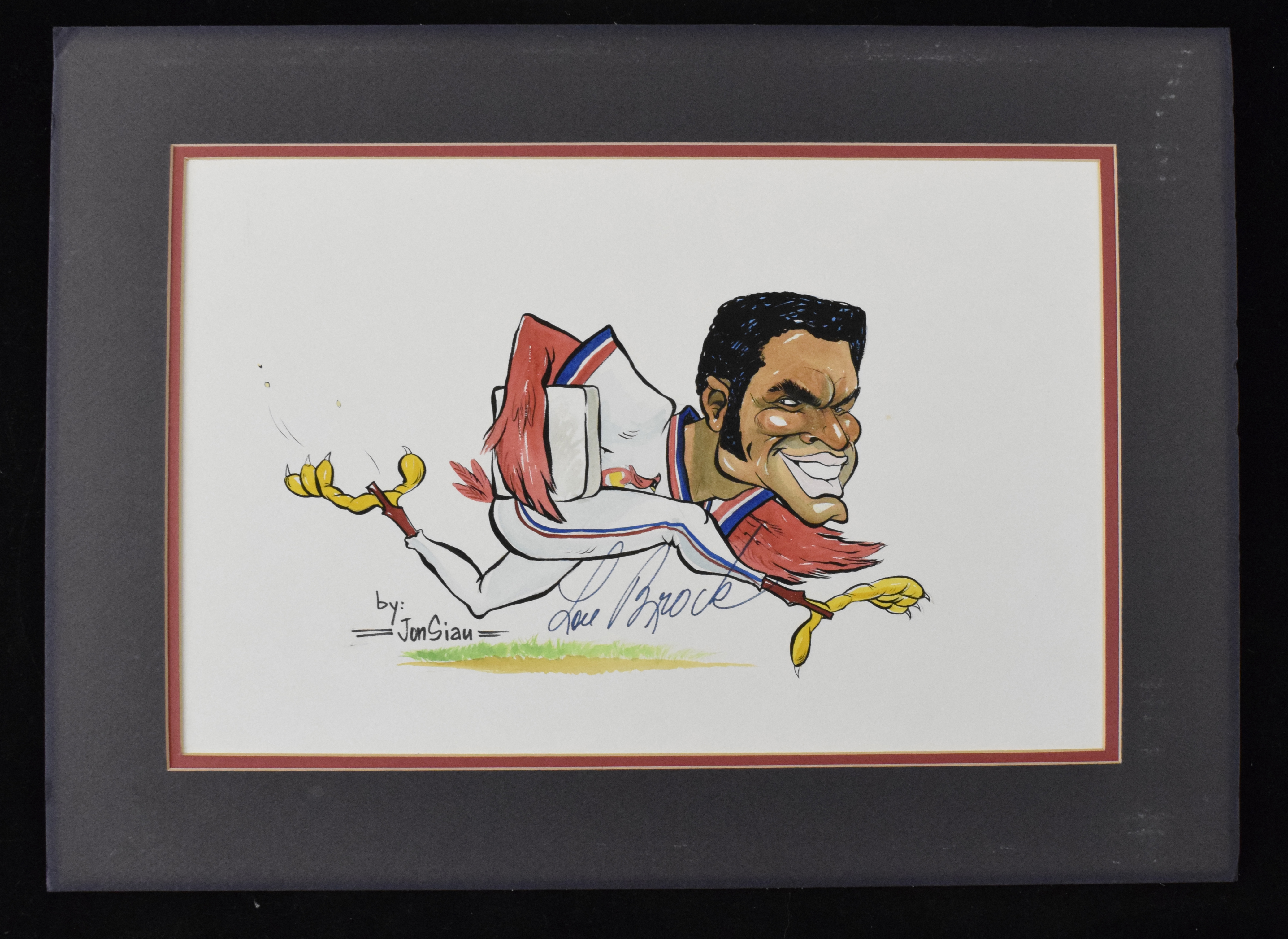 Description:Lou Brock autographed caricature artwork also signed by artist Jon Siau (EX/MT-NM matted). Matting measures approx. 16"x22". Depicts an image of Brock with bird wings carrying a base. Brock signed the piece in blue marker. Signature rates 8/9 out of 10. Also signed by Jon Siau: EX/MT-NM ($300-$500)