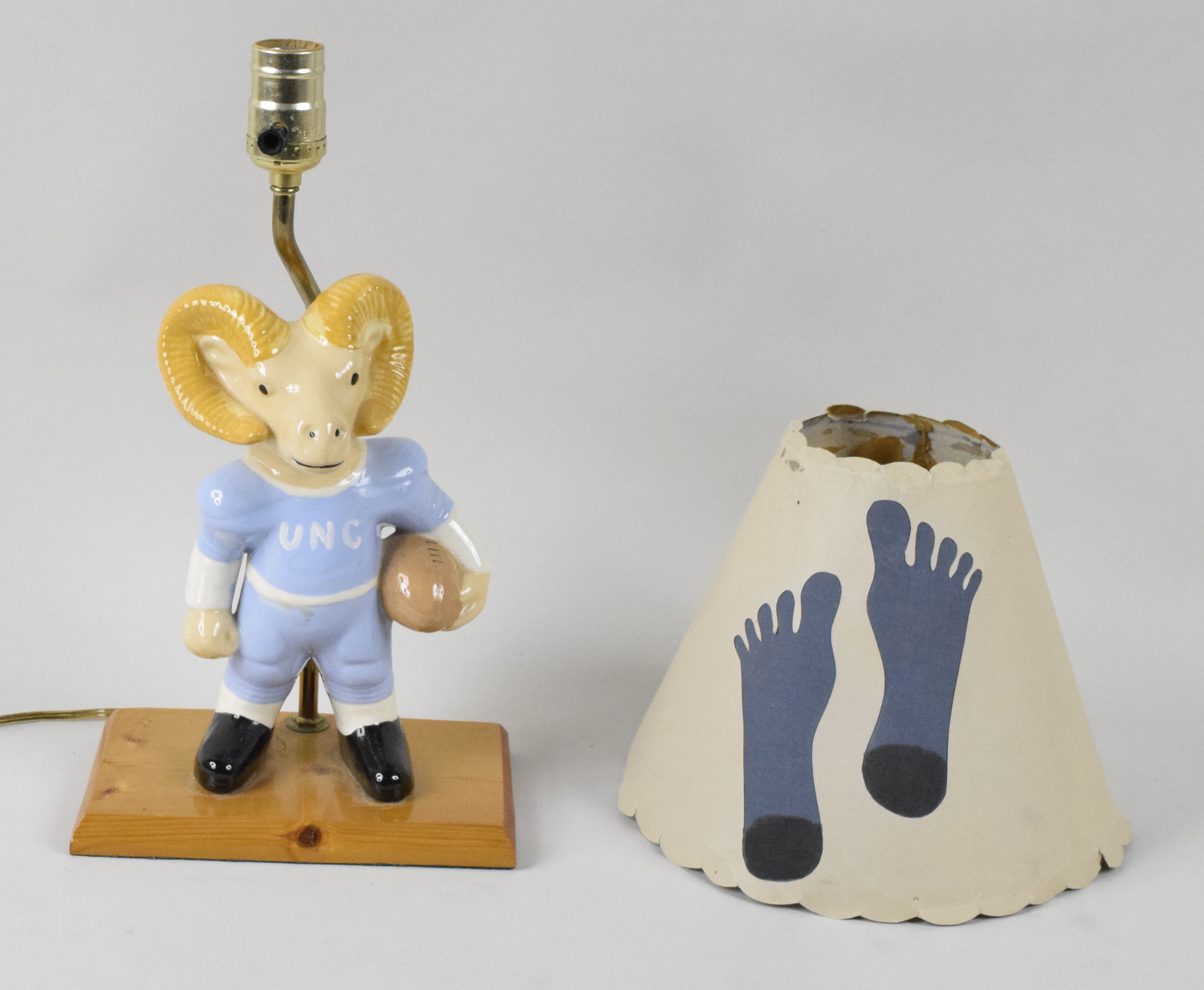 Description:Rarely seen North Carolina Tar Heels vintage figural lamp (EX/MT). Approx. 10" tall ceramic mascot standing on wooden base. Minimal wear to the mascot, and still in working order when tested with a bulb. Includes original thick paper shade (minor creases), but metal attachment is currently detached, and would need to be reattached in order to place the shade on a bulb: EX/MT overall ($300-$500)