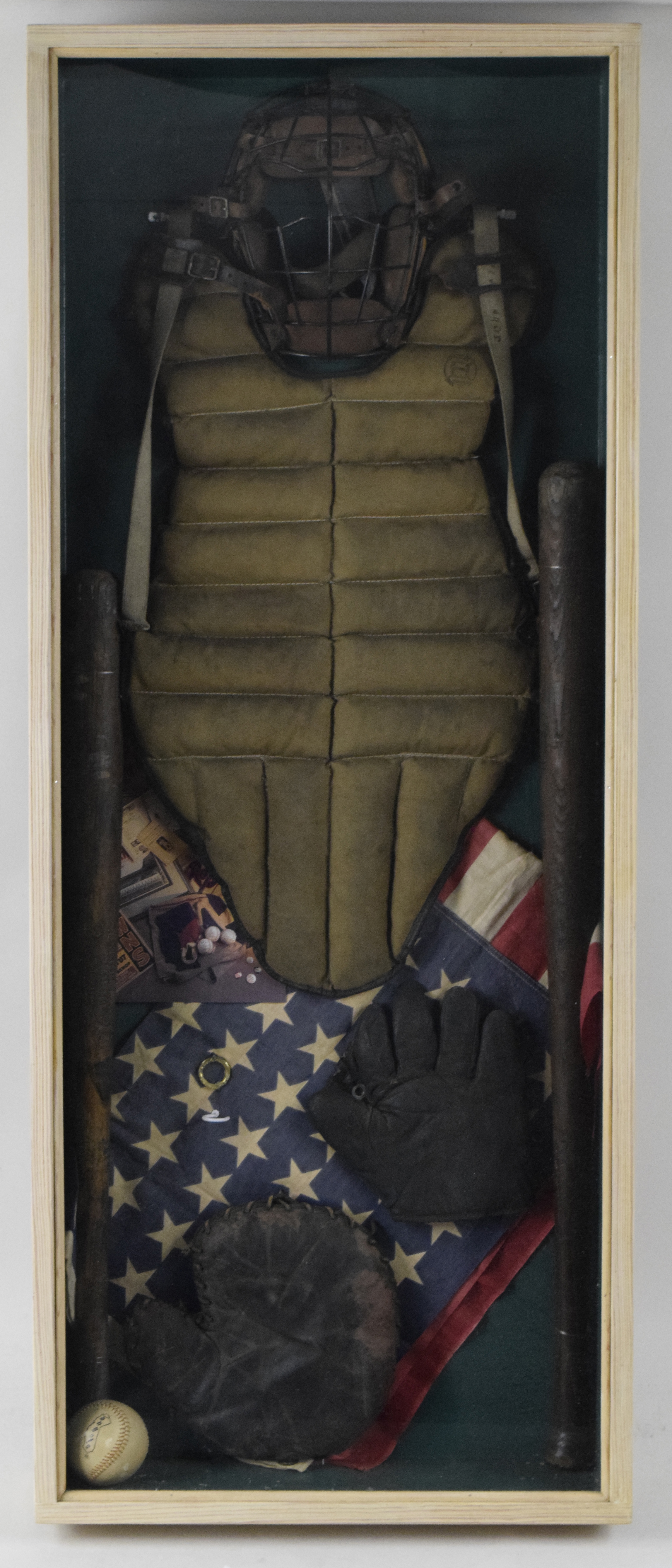 Description:Very fine framed display of vintage baseball equipment (VG-EX/MT). Approx. 20"x49.5" shadow box style display containing an early catcher's mask (maker not visible), Reach chest protector, (2) Hillerich & Bradsby baseball bats, 1" web baseball glove, catcher's mitt, and baseball, with an American flag folded as a background within the display (owner relayed that it is a vintage 48-star flag). Due to framing, all aspects are not visible, and complete conditions are unknown, but most items appear to average VG/EX-EX overall. Range: VG-EX/MT ($400-$600)