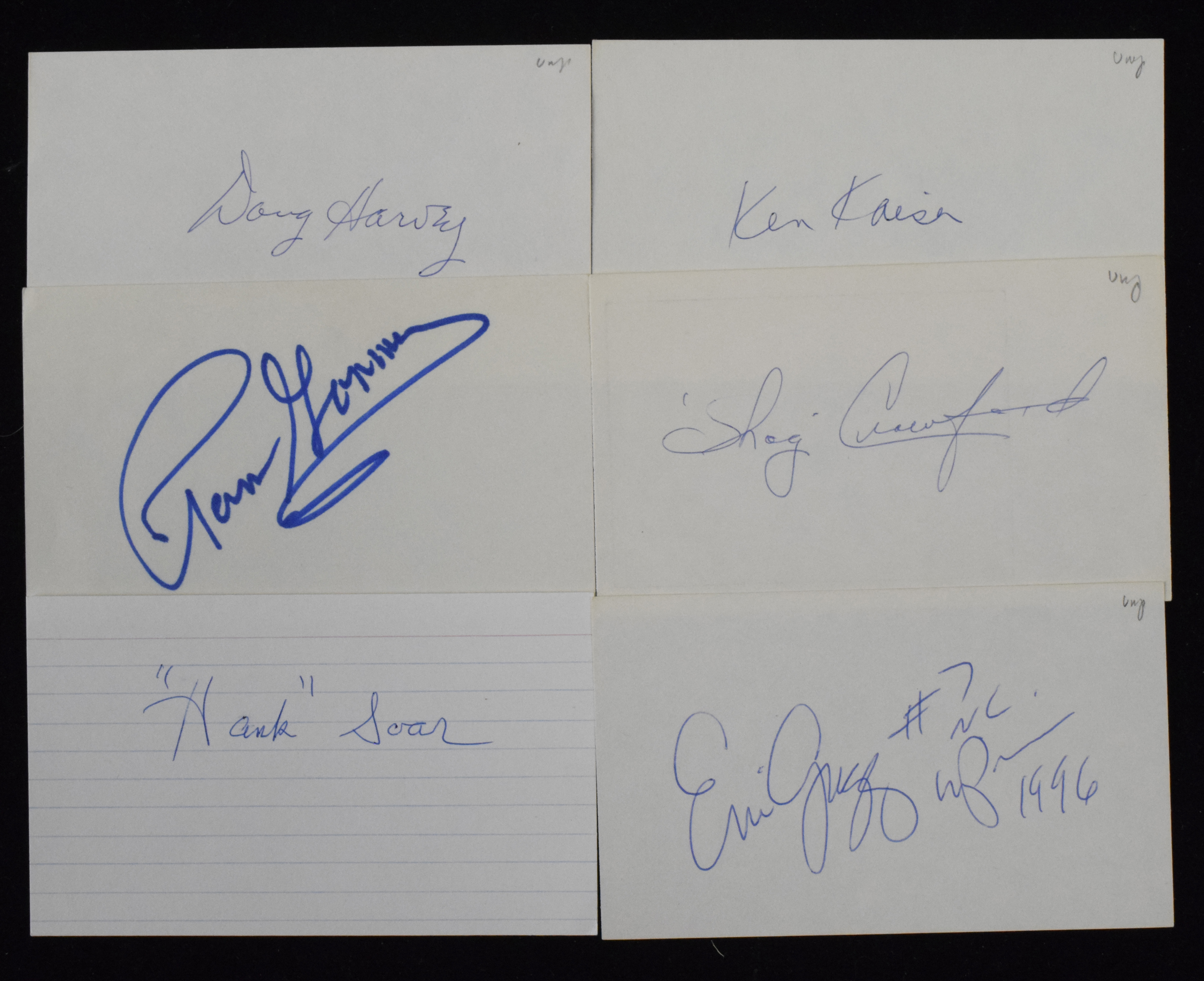 Description:Nice lot of approx. (250) umpire autographs including rare "scab" replacement umpires (VG/EX-NM/MT). Nearly all are signed index cards, with a few other signed flats mixed in. Highlights include Doug Harvey, Don Denkinger, Art Frant, Augie Donatelli, Gary Darling, Bruce Froemming, Bill Jackowski, Tom Gorman, Ron Luciano, Hank Soar, Jim Joyce, Larry Napp, Shag Crawford, Terry Tata, Eric Gregg, Lee Ballanfant, John McSherry, Ted Barrett, Charlie Williams, Ed Vargo, Tim Welke, Larry Vanover, Jerry Crawford, Dale Ford, Rich Garcia, John Hirschbeck, Mark Hirschbeck, Ken Kaiser, Jeff Kellogg, Tim McClelland, Larry McCoy, Chuck Meriwether, Durwood Merrill, Eddie Montague, Dick Nelson, Steve Palermo, Ed Rapuano, Charlie Reliford, Dutch Rennert, Steve Rippley, and many others including approx. (100) replacement umpires used during strike seasons. Signatures rate 6/7 to 10 (avg 8/9) out of 10. The lot has been screened for authenticity, but due to obscurity, it is possible that secretarial signatures may have slipped through. Most index cards appear to average EX/MT-NM overall. Range: VG/EX-NM/MT ($300-$500)