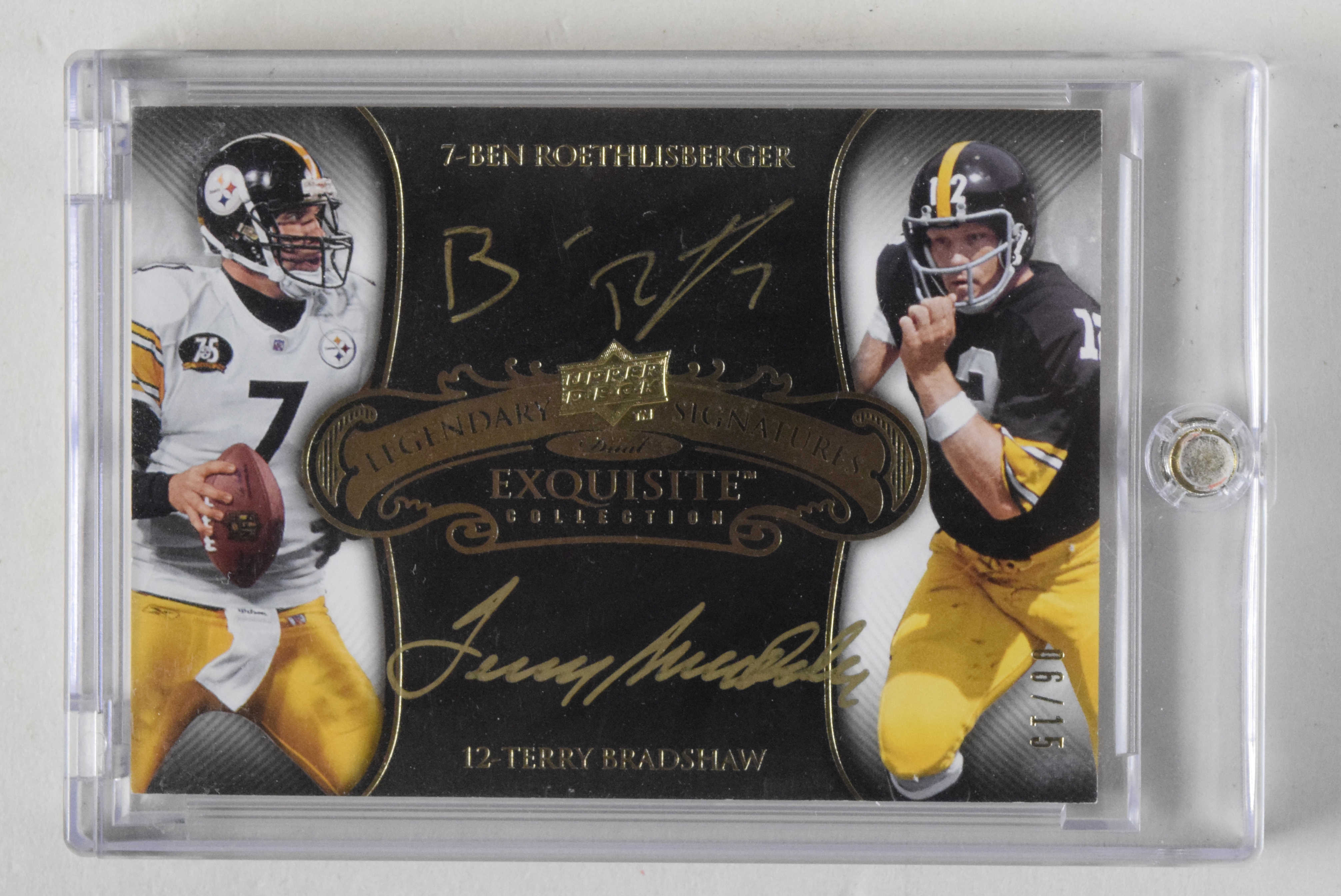 Description:Terry Bradshaw & Ben Roethlisberger dual-signed 2008 Upper Deck Exquisite insert card #ed 6/15 (NM/MT). 2008 Upper Deck Exquisite Collection "Legendary Signatures Dual Gold Ink" #EG2S-BR signed by both Bradshaw and Roethlisberger in gold paint pen. Signatures rate 9 to 10 out of 10. The card is numbered 6/15: NM/MT ($400-$600)