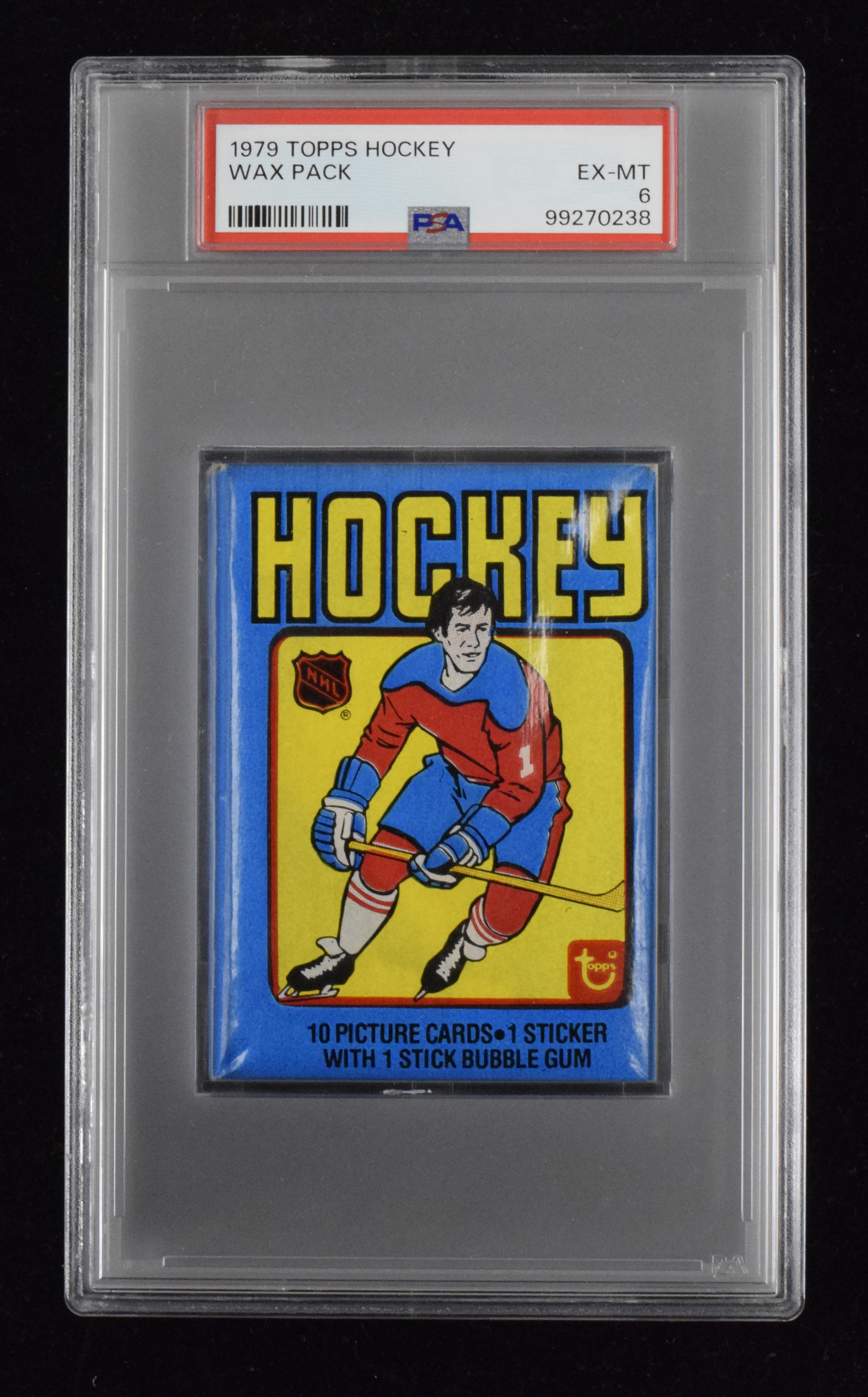 Description:1979-80 Topps Hockey wax pack graded PSA 6 (EX/MT). Coveted year highlighted by the sought-after Wayne Gretzky rookie card. Pack contains 10-cards plus 1-sticker insert. Encapsulated by PSA with a grade of 6: EX/MT ($400-$600)
