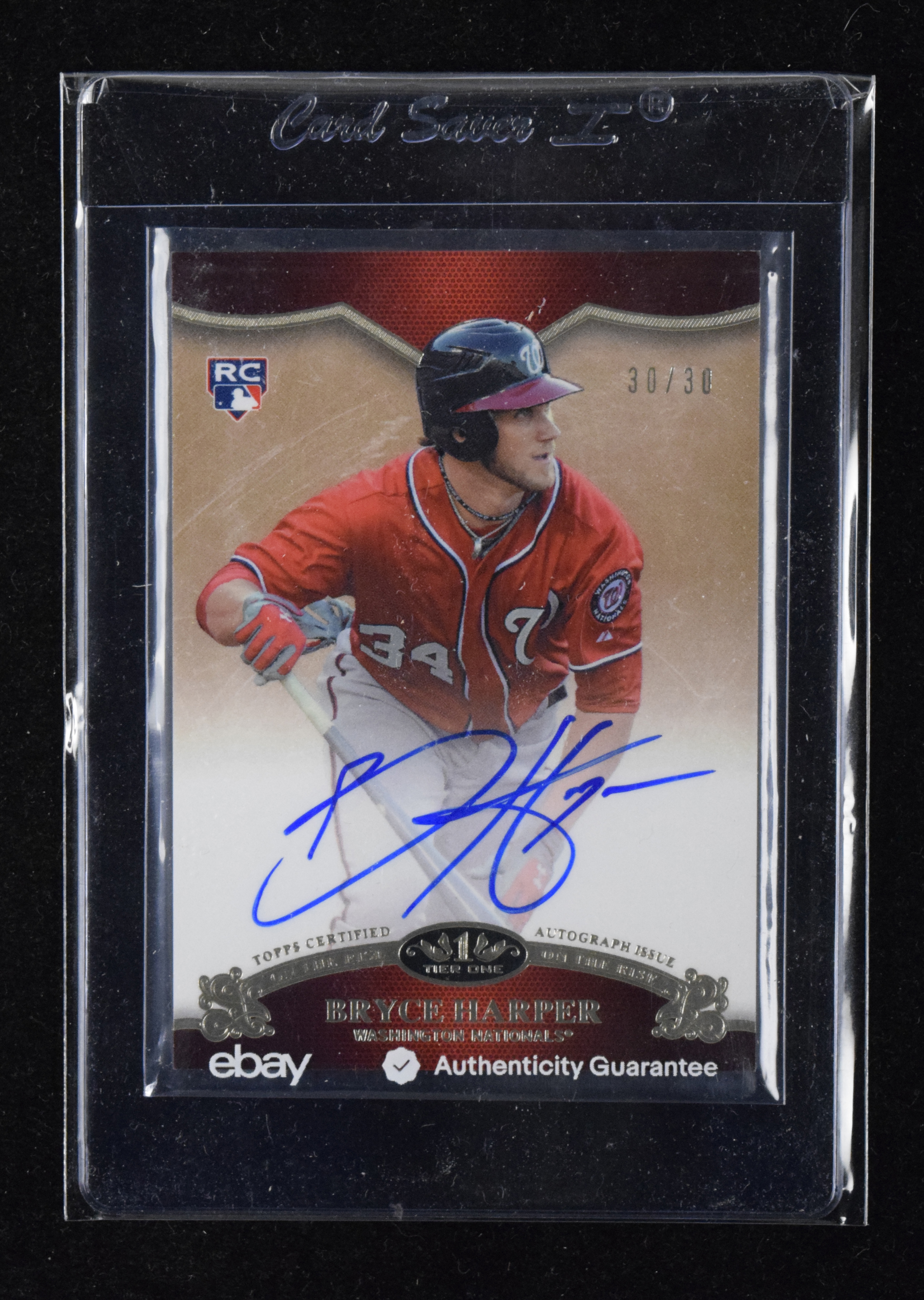 Description:2012 Topps Tier One (#30/30) Bryce Harper on-card autographed RC (30/30) (Ebay authenticated; MT). Crisp Bryce Harper On The Rise rookie card #OR-BH has been signed on the front by Harper in blue marker, rating 9/10 out of 10. Card is numbered 30/30 on the front, and appears MT with just the slightest hints of white to two corners, noticeable only on the reverse. Card has passed through eBay's Authenticity program and remains sealed with authenticity sticker intact. ($500-$1,000)