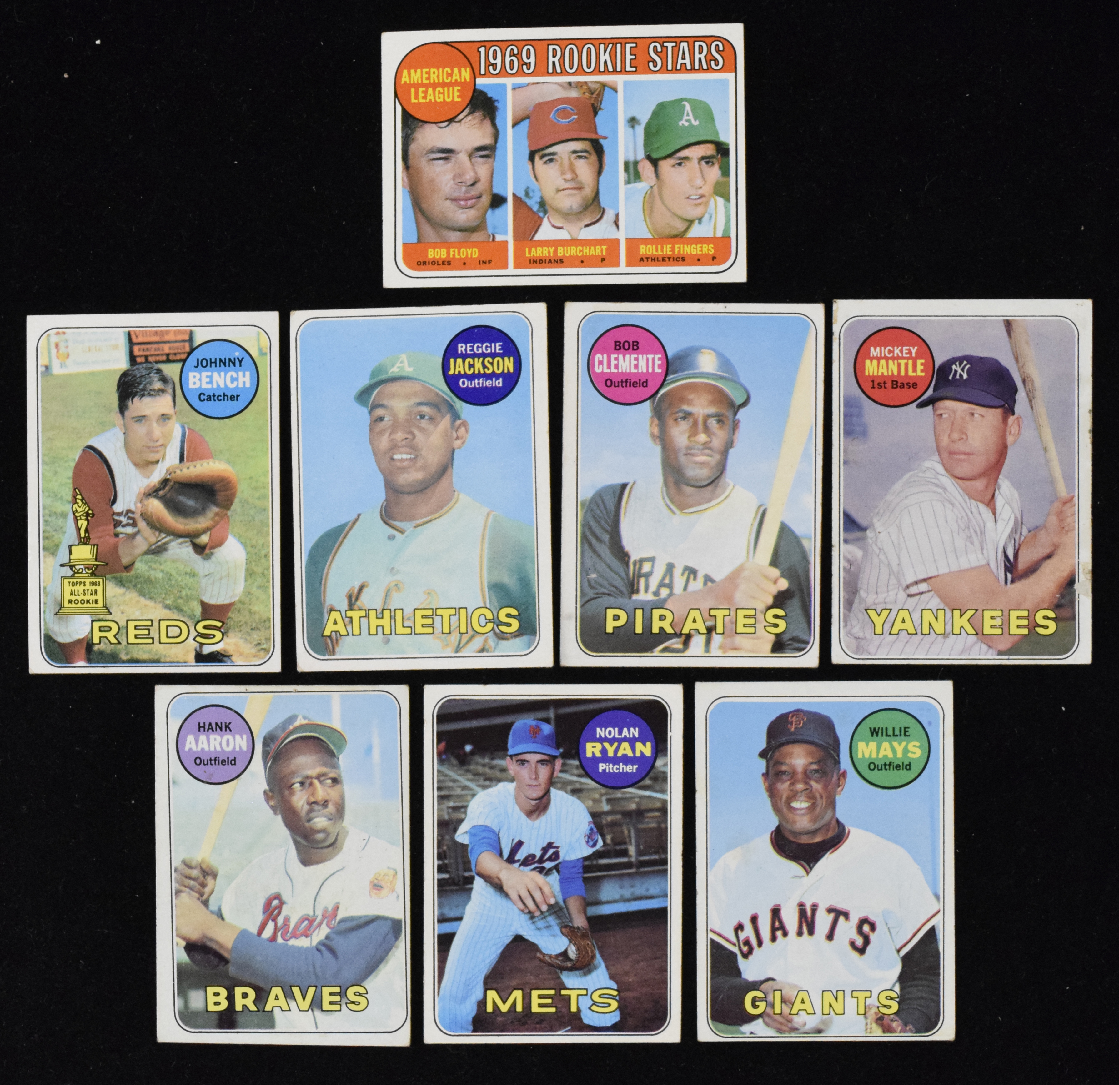 Description:1969 Topps complete set (664) with Reggie Jackson RC (PR-EX/MT). Mostly lower-grade complete set of (664) different cards is highlighted by the last playing-era card of Mickey Mantle (#500 yellow name (PR), as well as the rookie cards of Reggie Jackson (#260; VG OC) and Rollie Fingers (#597 VG/EX +). Other key cards include #s 50 Roberto Clemente (VG OC ), 95 Johnny Bench (VG/EX), 100 Hank Aaron (FR), 120 Pete Rose (VG), 190 Willie Mays (VG OC), 480 Tom Seaver (VG/EX OC) and 533 Nolan Ryan (VG/EX) and numerous other Hall of Famers. Balance of the set appears mostly VG-VG/EX. Range: PR-EX ($750-1,250)