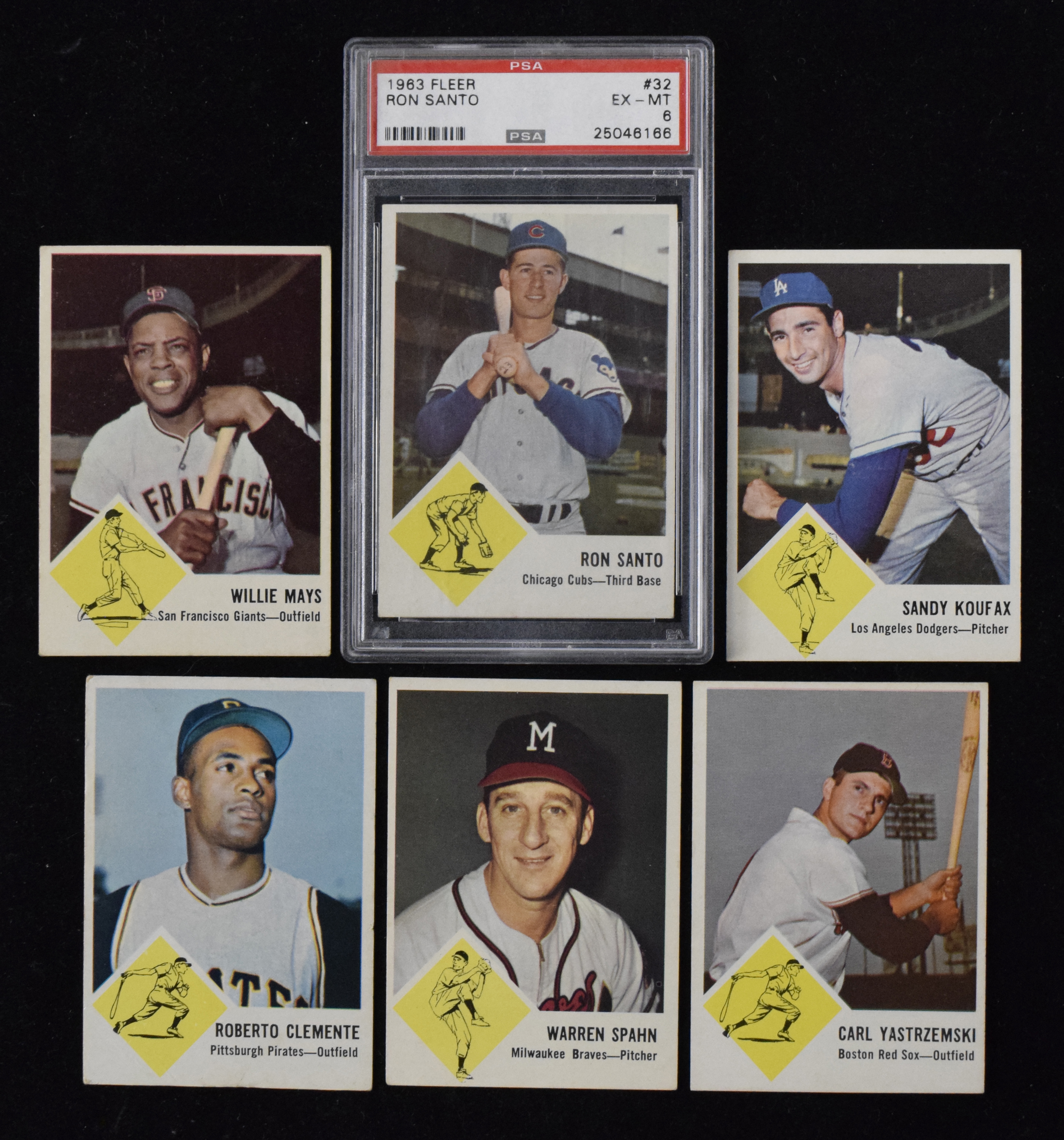 Description:1963 Fleer complete set with with HOFers, minus checklist (PR-EX/MT). Desirable complete set of (66) different cards is missing the short-printed checklist but includes all other cards, plus (2) #32 Ron Santo (one is graded PSA 6 EX/MT). Other key cards include #s 5 Willie Mays (VG; stain on reverse), 8 Carl Yastrzemski (VG/EX), 42 Sandy Koufax (EX), 43 Maury Wills RC (VG), 45 Warren Spahn (VG/EX), 56 Roberto Clemente (PR) and 61 Bob Gibson (VG). Balance of the set appears mostly VG-VG/EX with some better and some worse, including several cards with wax stains on the reverse as is common with this year. Range: PR-EX/MT ($400-$600)