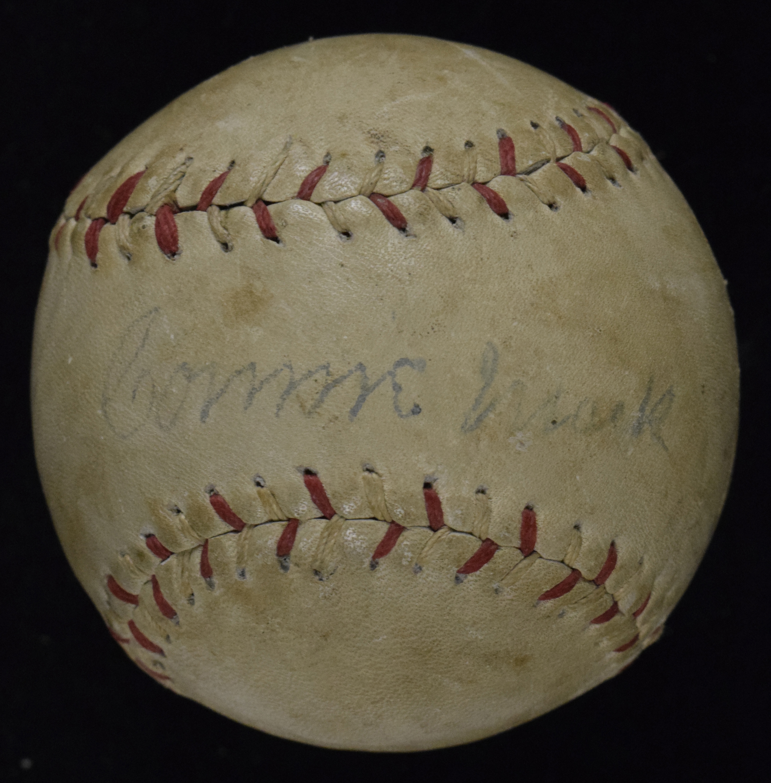 Description:Connie Mack autographed baseball - JSA (VG). CB Co. brand ball signed on the sweet spot by Mack in vintage black fountain pen. Signature rates 6 out of 10 due to some fading. Includes full LOA from JSA. The ball appears used, with scattered surface wear: VG ($500-$1,000)