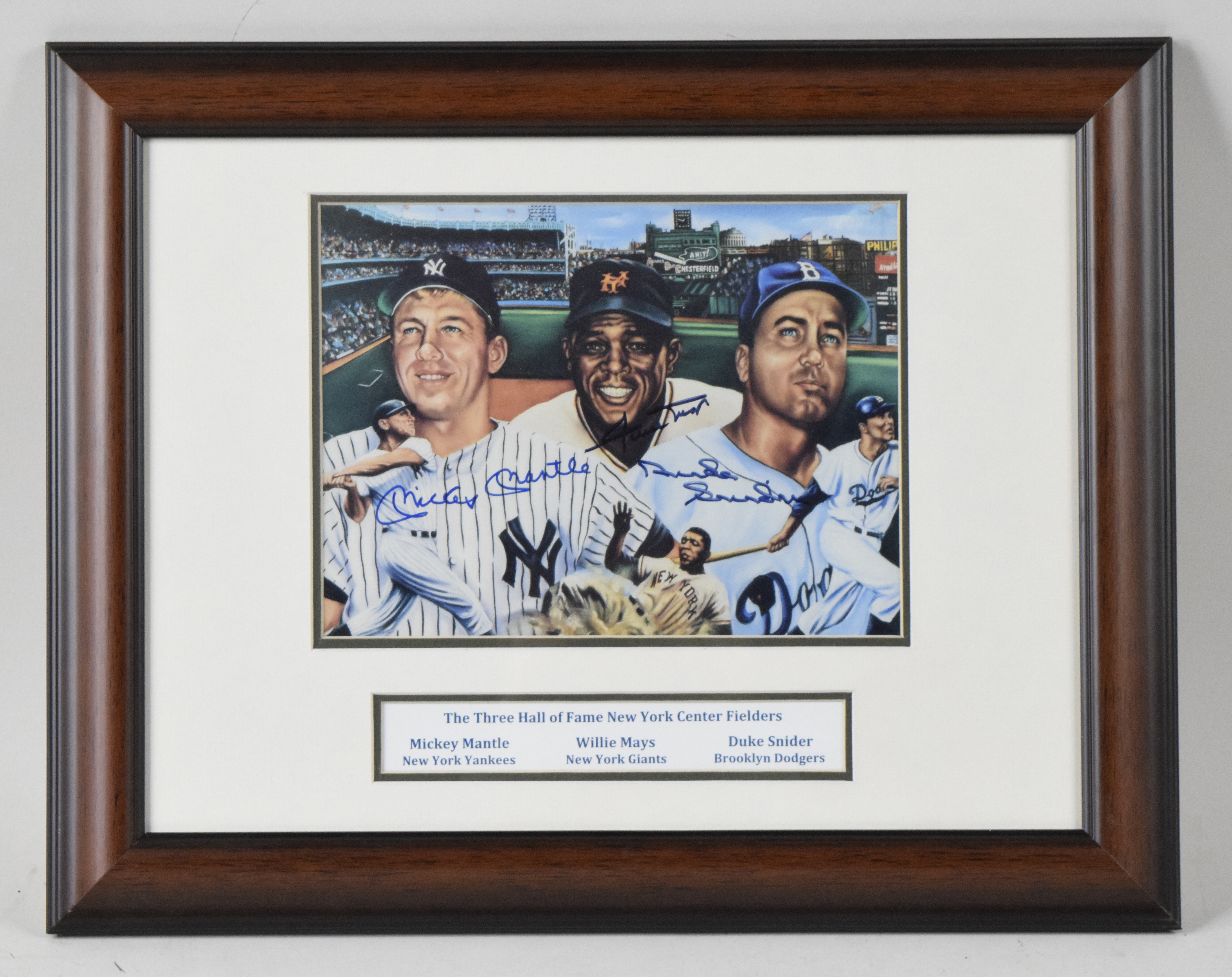 Description:Mickey Mantle, Willie Mays, and Duke Snider multi-signed framed print (NM). Approx. 15"x19" framed print signed by Willie, Mickey, and The Duke in blue marker. Signatures rate 9 to 10 out of 10. Due to framing, complete condition is unknown: NM appearance ($500-$750)