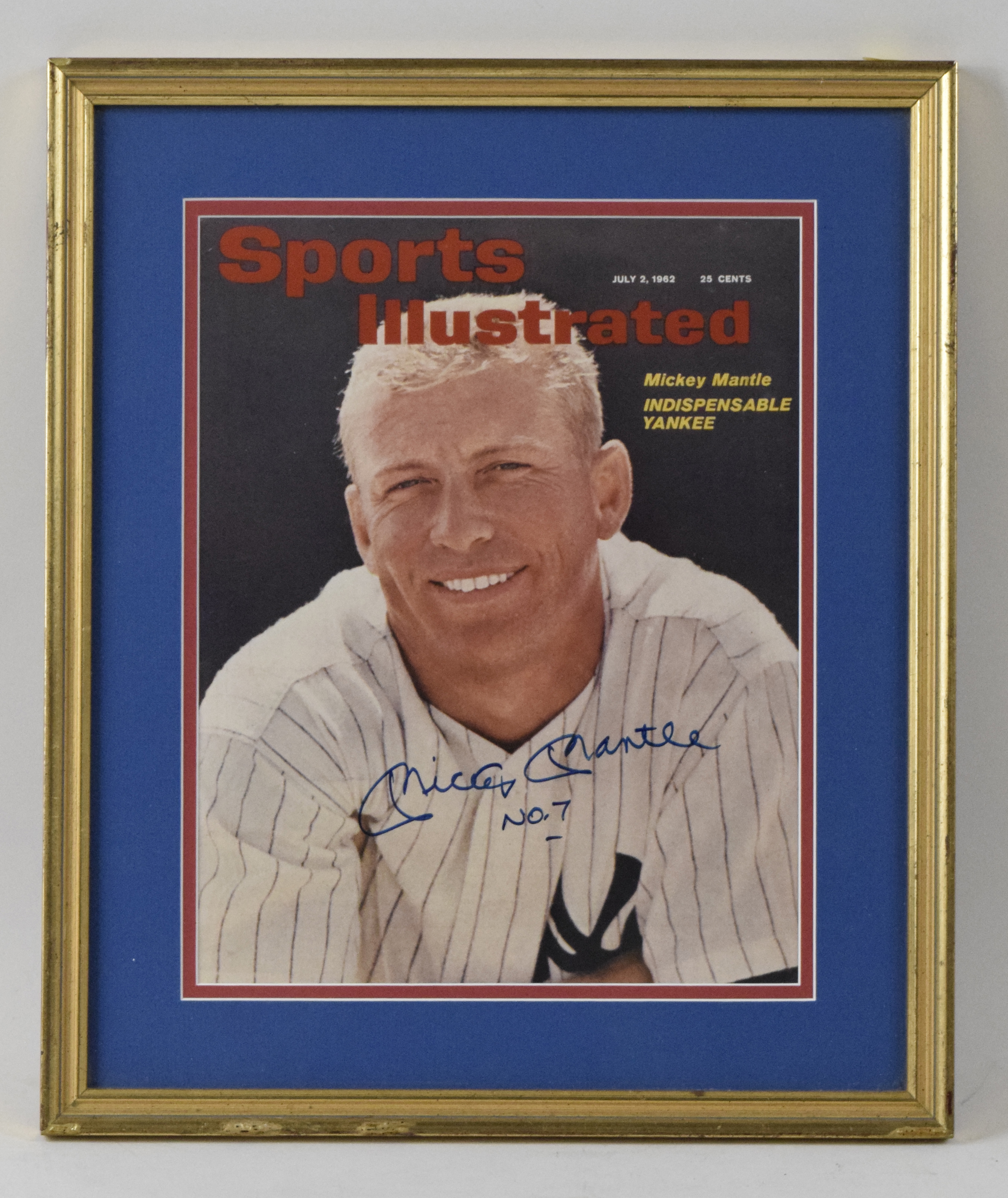 Description:Mickey Mantle signed oversize Sports Illustrated cover photo with "No.7" inscription - JSA (NM framed). Approx. 16"x19" framed oversize image of the 7/2/1962 cover signed by Mantle in blue marker with "NO. 7" inscription. Signature rates 9/10 out of 10. Includes JSA full LOA. Due to framing, complete condition is unknown: NM appearance ($500-$750)