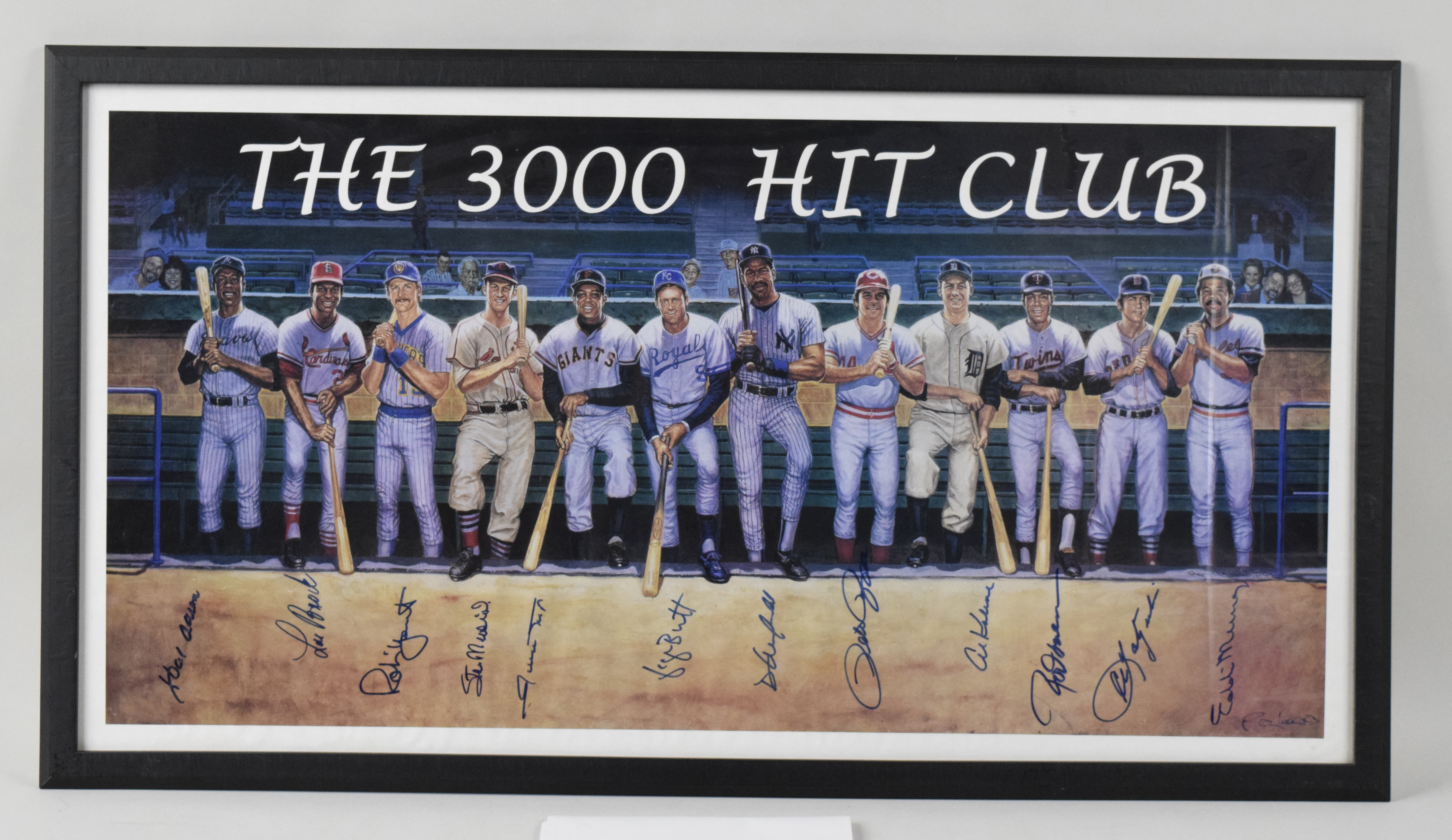 Description:3,000 Hit Club poster signed by (12), including Hank Aaron, Willie May (Sigs. MT). Ron Lewis 3,000 Hit Club poster has been framed to 39"x22, and signed in blue marker by (12) members of the club: Hank Aaron, Lou Brock, Robin Yount, Stan Musial, Willie Mays, George Brett, Dave Winfield, Pete Rose, Al Kaline, Rod Carew, Carl Yastrzemski and Eddie Murray. Signatures rate 9/10 out of 10 and poster appears EX/MT, though complete condition is unknown due to framing. ($400-$600)