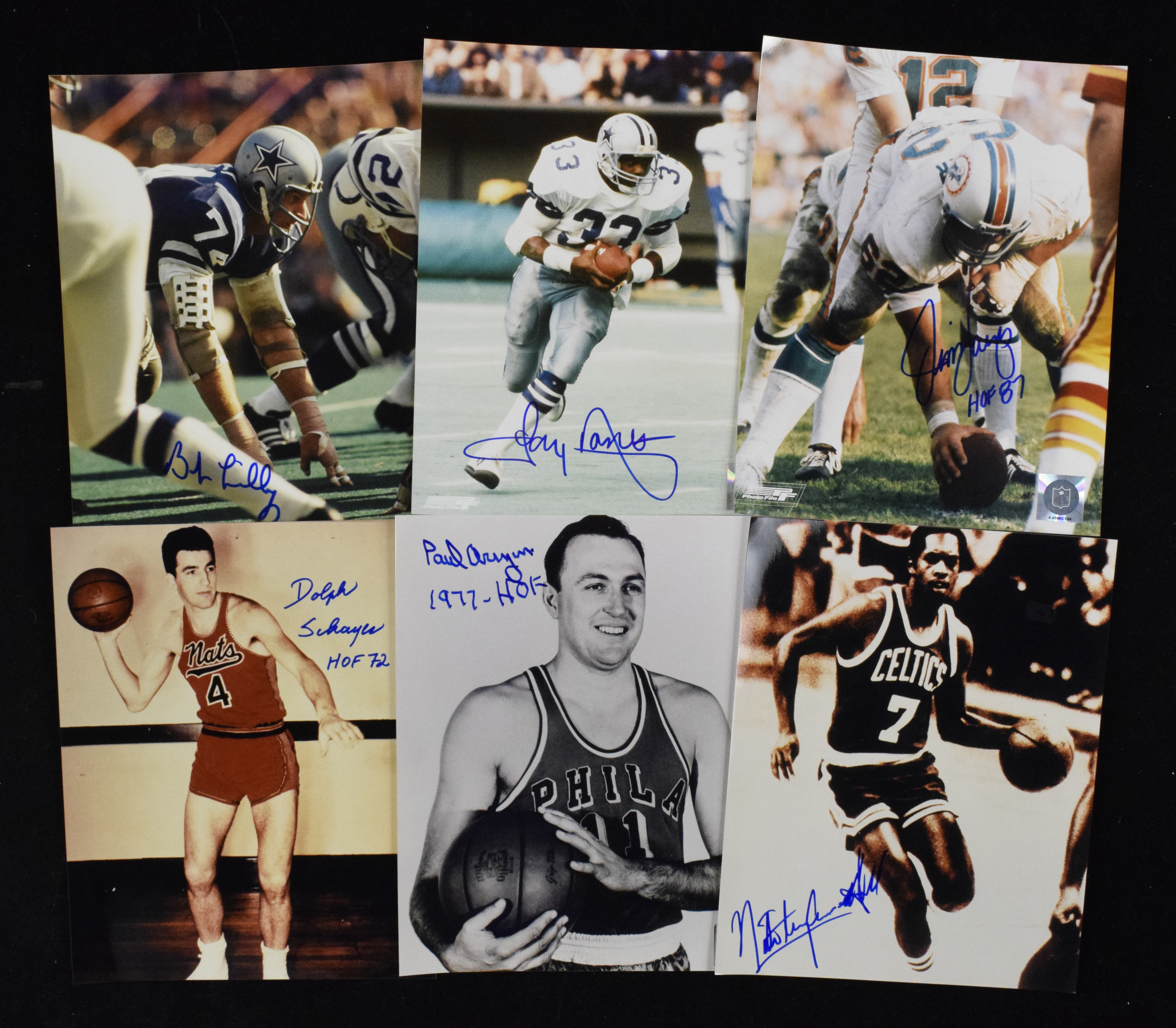 Description:Lot of (12) NFL and NBA HOFer autographed 8"x10" photos, including Dorsett, Archibald and Arizin (Sigs. NM/MT-MT). Very nice assortment of 8"x10" photos, each of which has been signed by a NFL or NBA Hall of Famer, many of whom added induction year inscriptions. Photos are signed by Jim Langer, George Connor, Yale Lary, Bob Lilly, Tony Dorsett, John Henry Johnson, Doug Atkins, (2) Clyde Lovellette, Nate Tiny Archibald, Paul Arizin and Dolph Schayes. Signatures rate 8/9 out of 10, and photos range EX/MT-NM.