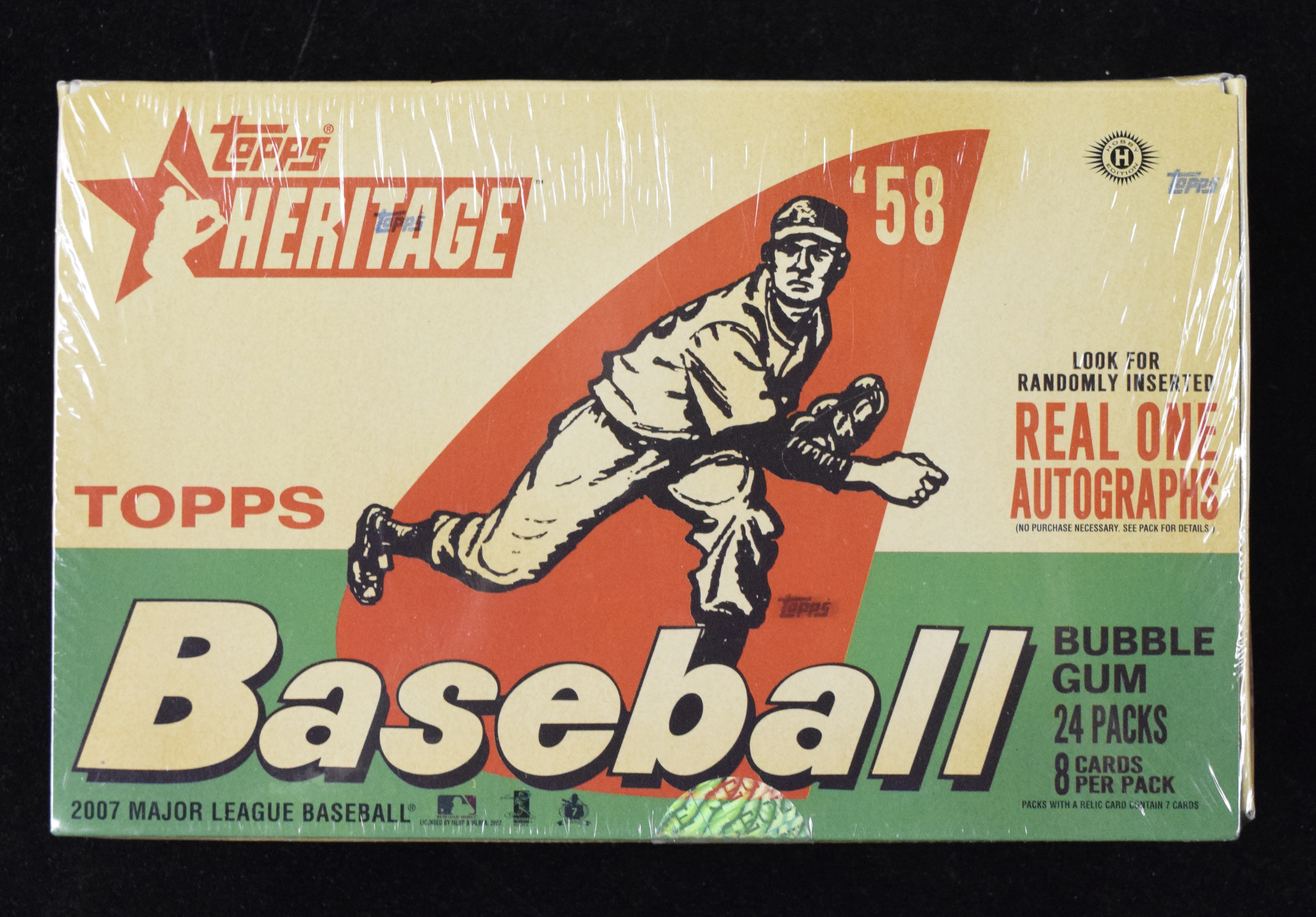 Description:2007 Topps Heritage factory-sealed hobby box with (24) unopened packs (NM). Very nice original 2007 Topps Heritage hobby box, based on the iconic 1958 Topps design, includes (24) unopened packs with 8 cards per pack. Autograph cards are randomly inserted. Box remains in its original factory shrink-wrapping: NM.