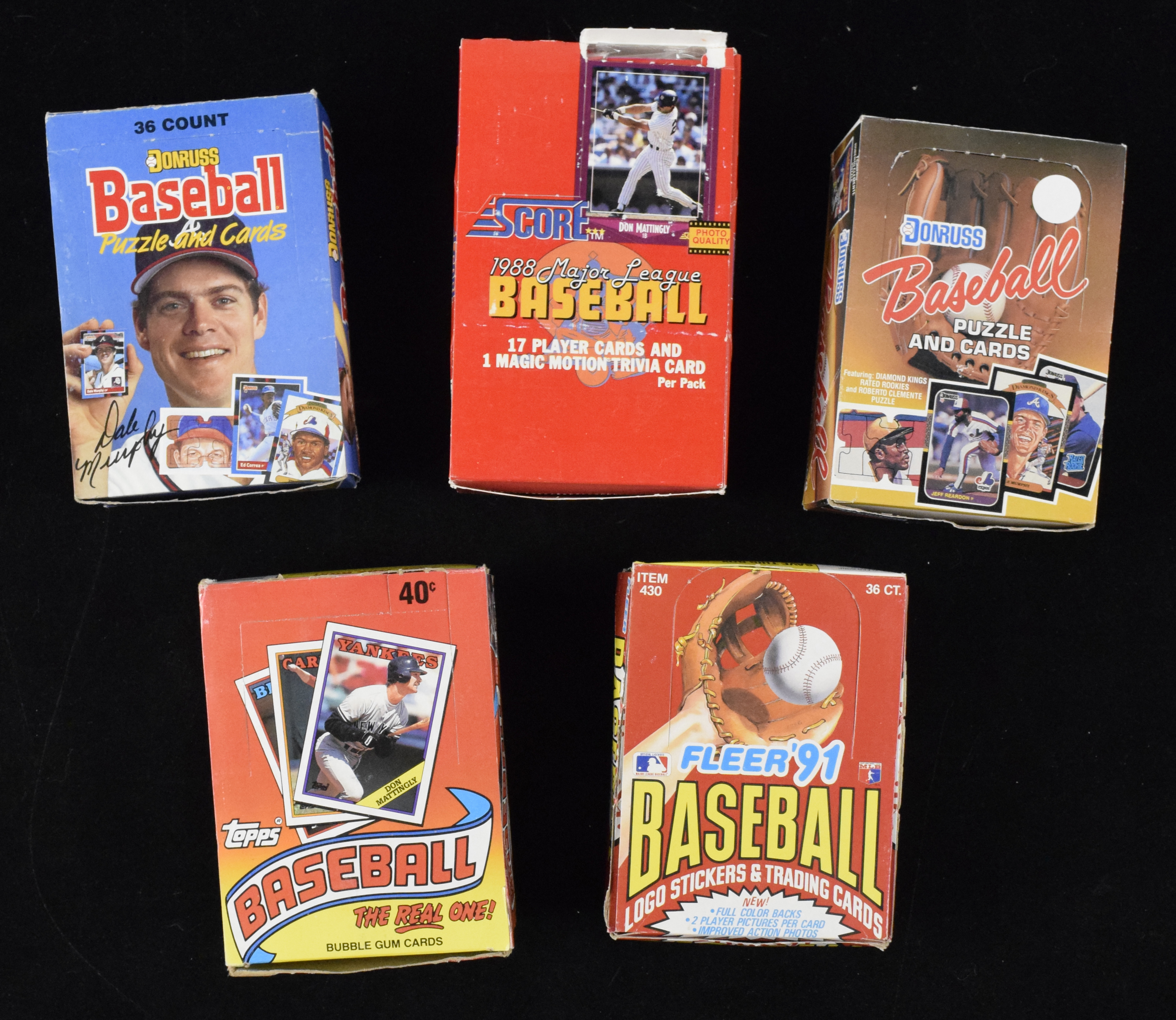 Description:Lot of (5) 1987-1991 Topps, Donruss and Fleer wax boxes with unopened packs (packs: NM). Each box has (36) unopened packs. Includes (1) 1987 Donruss wax box; (1) 1988 Score wax box; (1) 1988 Donruss wax box; (1( 1988 Topps wax box and (1) 1991 Fleer wax box. Boxes have light shelf wear (EX/MT) and packs are tightly sealed: NM.