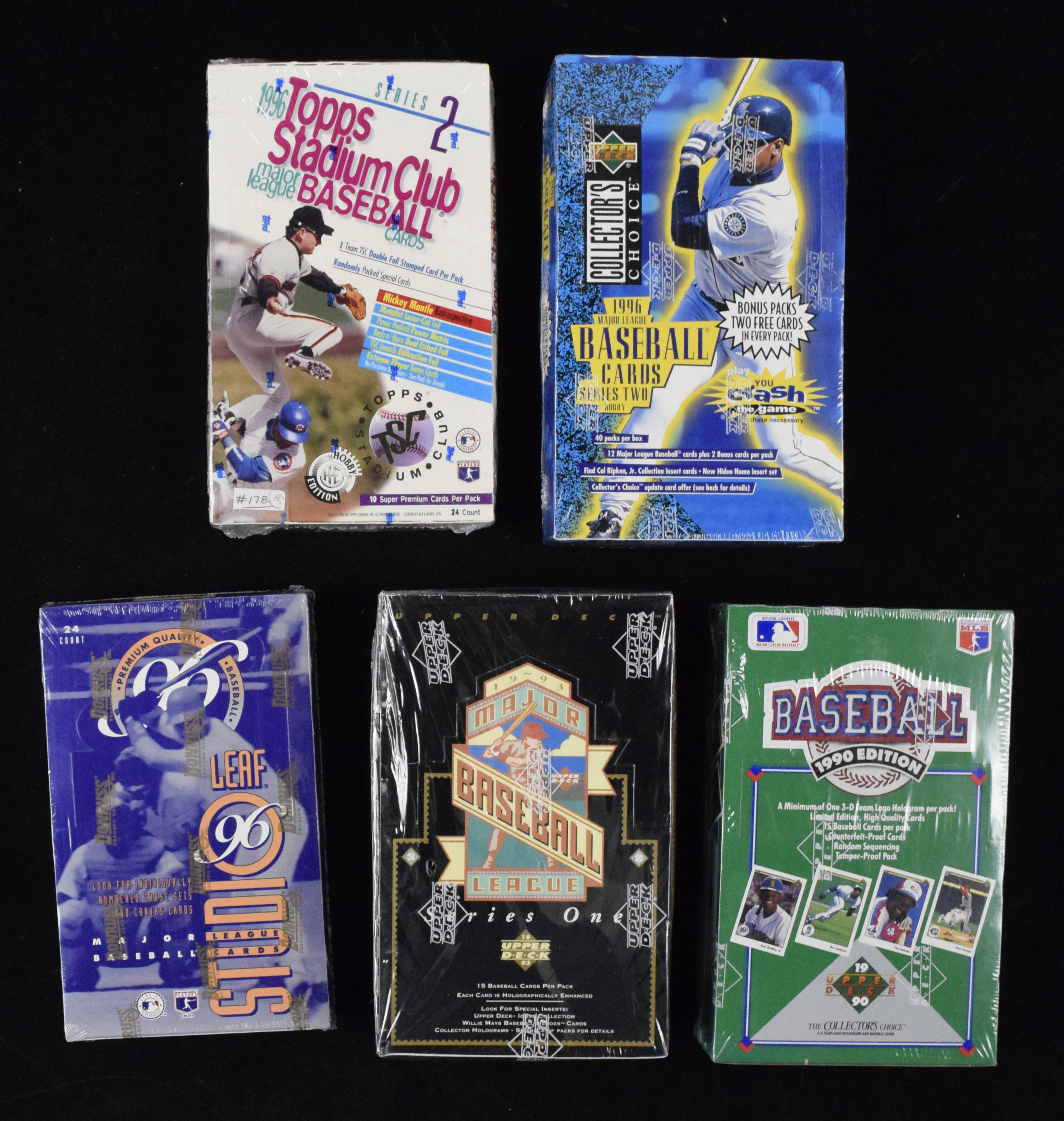 Description:Lot of (5) 1990-1996 Topps, Leaf and Upper factory-sealed hobby boxes (NM-NM/MT). Each box remains factory-sealed in its original shrink-wrapping. Includes (1) 1990 Upper Deck hobby box; (1) 1993 Upper Deck Series 1 hobby box; (1) Leaf Studio hobby box; (1) Topps Stadium Club Series 2 hobby box; and (1) 1996 Upper Deck Collector's Choice Series 2 hobby box. Boxes have little to no wear: NM-NM/MT.