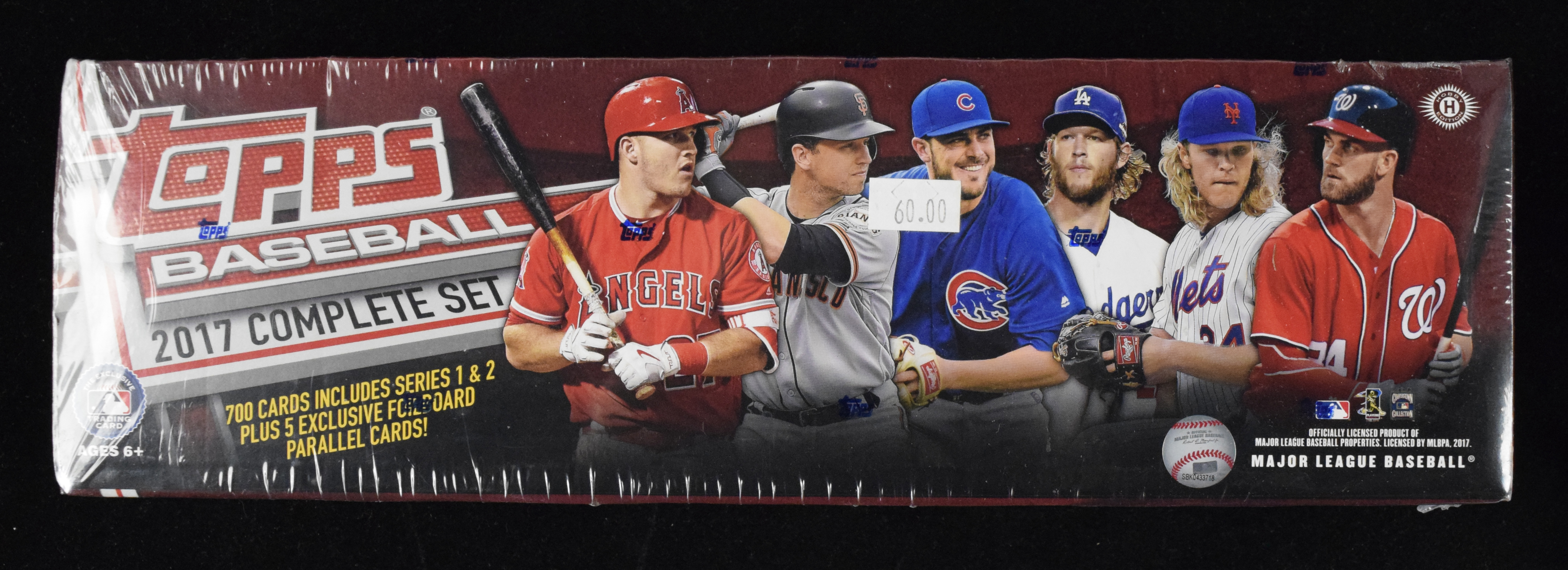 Description:2017 Topps sealed factory set with Aaron Judge RC (MT). Set remains in its original factory-sealed shrink-wrapping from Topps (with original retail price sticker affixed). Set with 700 cards plus 5 foil parallel cards includes the rookie card of superstar Aaron Judge. Box has little to no mentionabe wear: MT.