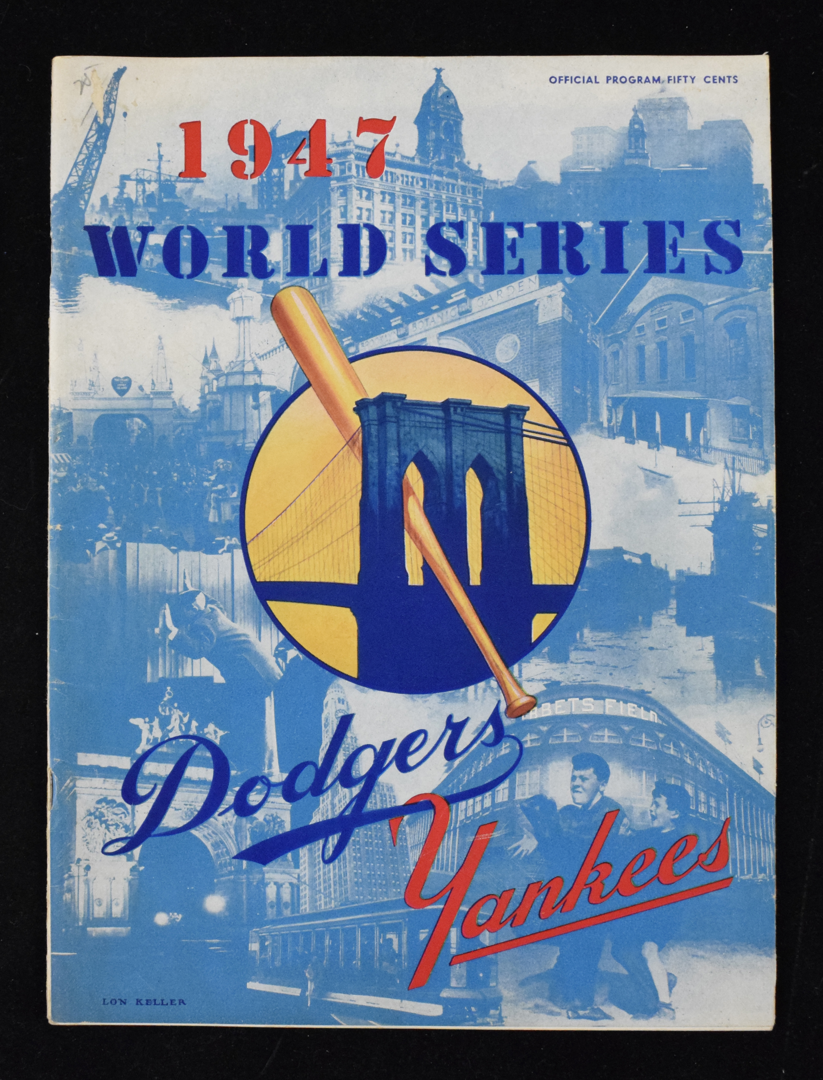 Description:1947 World Series program, Brooklyn Dodgers vs. N.Y. Yankees (VG/EX). Outstanding original program for the 1947 World Series between the Brooklyn Dodgers and N.Y. Yankees, won by the Yankees in seven. Notable series featured the rookie Jackie Robinson - marking the first time a racially integrated team played in a World Series in MLB history. Cover has a small area of paper loss in the upper left, along with a pencil mark, but program is otherwise clean and unscored with crisp interior pages: VG/EX.