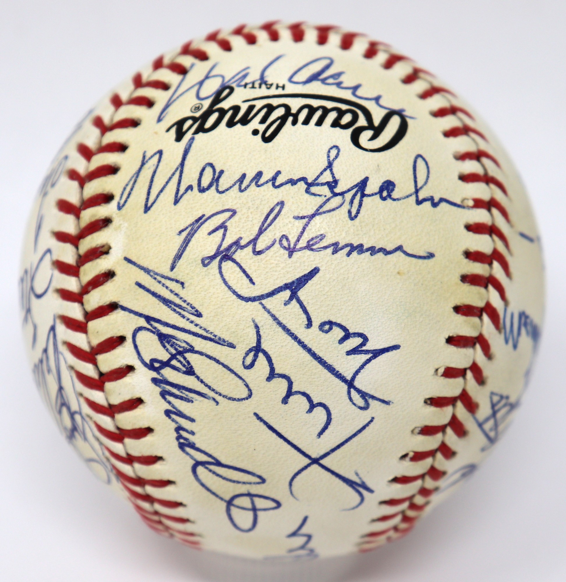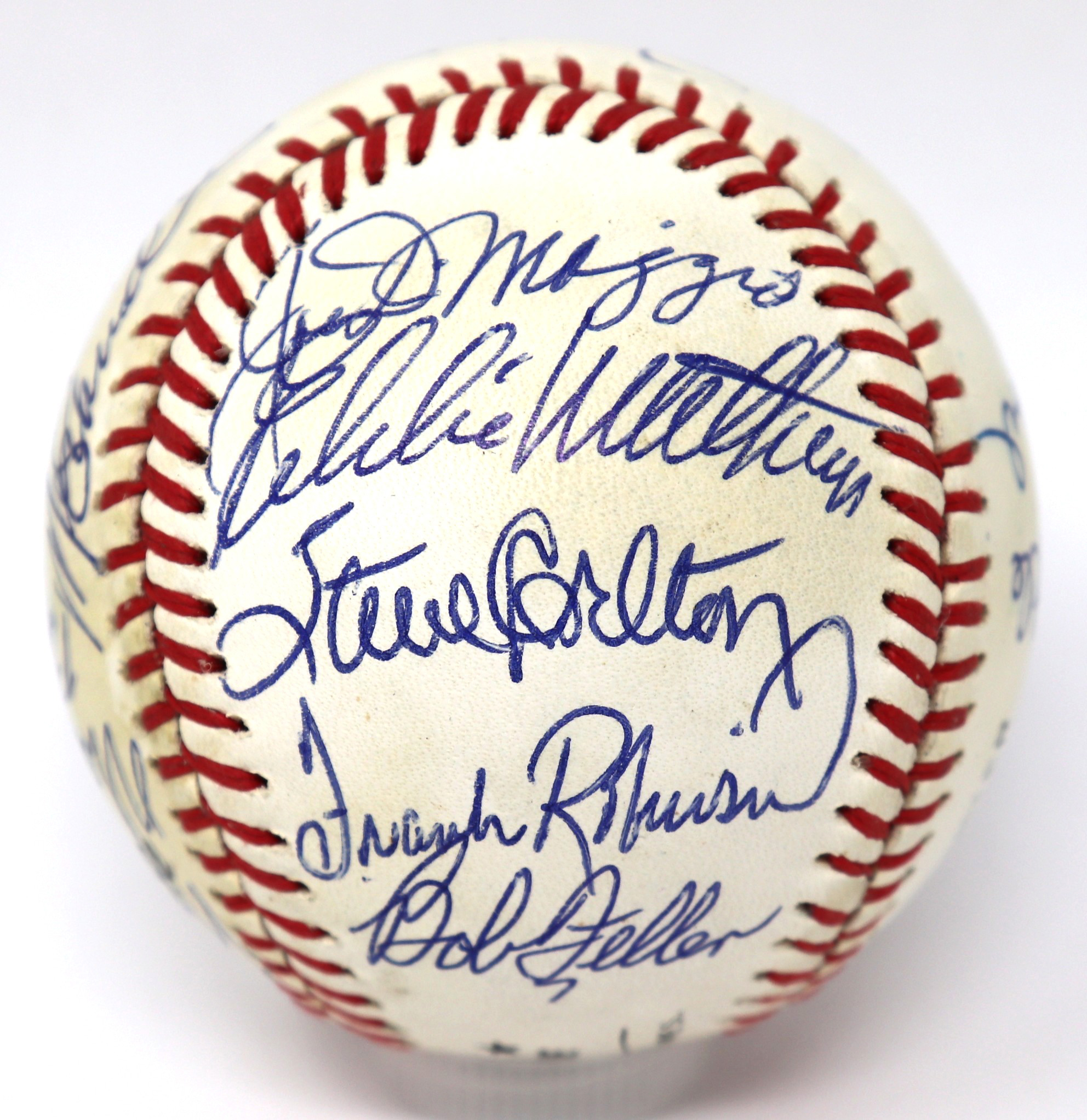 Description:Hall Of Famers multi-signed baseball with (18) autographs including Mantle, DiMaggio, Mays (EX-EX/MT). B.Giamatti official National League ball signed by (18) including Mickey Mantle, Joe DiMaggio, Willie Mays, Hank Aaron, Yogi Berra, Mike Schmiidt, Reggie Jackson, Brooks Robinson, Enos Slaughter, Lou Brock, Eddie Mathews, Steve Carlton, Frank Robinson, Bob Feller, Warren Spahn, Bob Lemon, Duke Snider, and Whitey Ford. Signatures rate 8 to 10 out of 10. Scattered areas of light to moderate toning: EX-EX/MT ($750-$1,000)