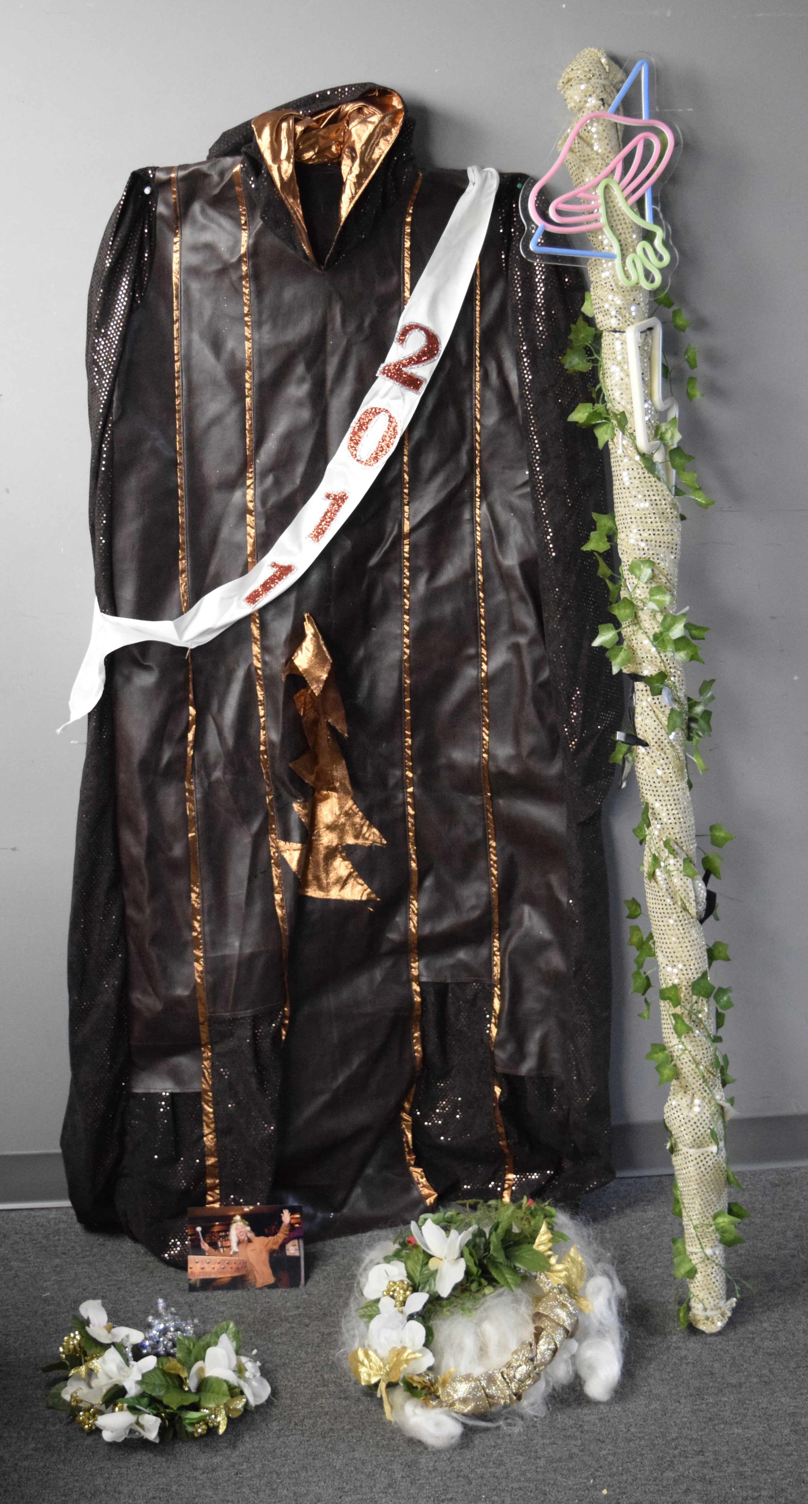Description:Bill Walton's 2011 New Year's Eve "Father Time" outfit (EX-EX/MT). Walton wore the outfit for an appearance during Furthur's concert at the Bill Graham Civic Center in San Francisco. Includes cloak, cape, floral crown, 2011 sash, staff, wig, and certificate of provenance from Walton Family: EX-EX/MT ($750-$1,500)