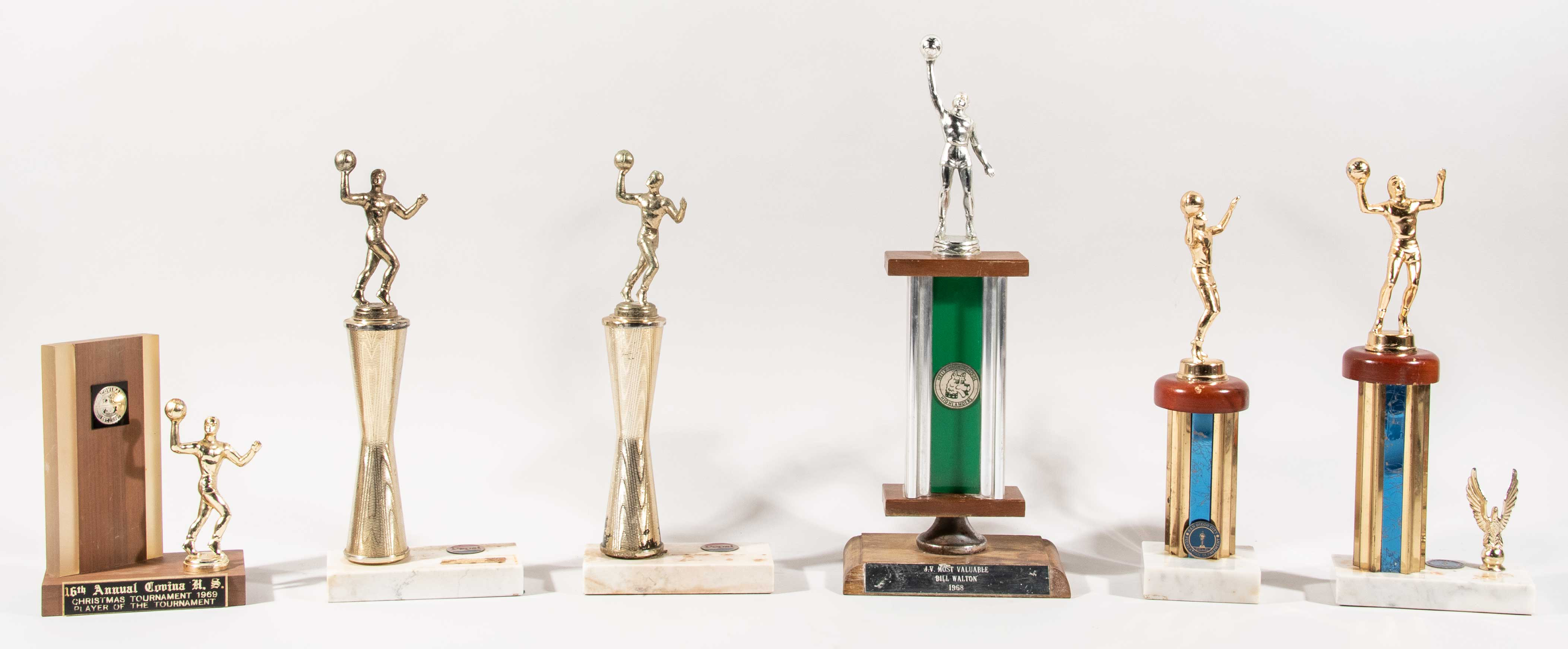 Description:Collection of Bill Walton's high school & youth athletics trophies & awards, c.1960-70 (GD-EX/MT). Total of (14) pieces dating predominantly to Walton's tenure at Helix High School during the late 1960s, most of which are related to basketball championships or tournament achievements. Includes 1969 Christmas Tournament championship trophy; 1964 Varsity champ trophy; 1969-70 Helix High School Athlete of the Year award; 1968 Fillmore Basketball Tournament medal (All Tournament); 1968 JV Most Valuable player trophy; 1969 Christmas Tournament Player of the Tournament trophy; and (2) San Diego City Recreation Dept trophies. About one third of the awards specifically have Walton titling rather than generic placards. Various condition grades with a few missing nameplates or small accoutrement pieces. Sizes range from 3" tall to 10" tall. Includes original 10" square image of Walton in game action with Helix High School, and certificate of provenance from Walton Family: Range GD-EX/MT ($750-$1,500)