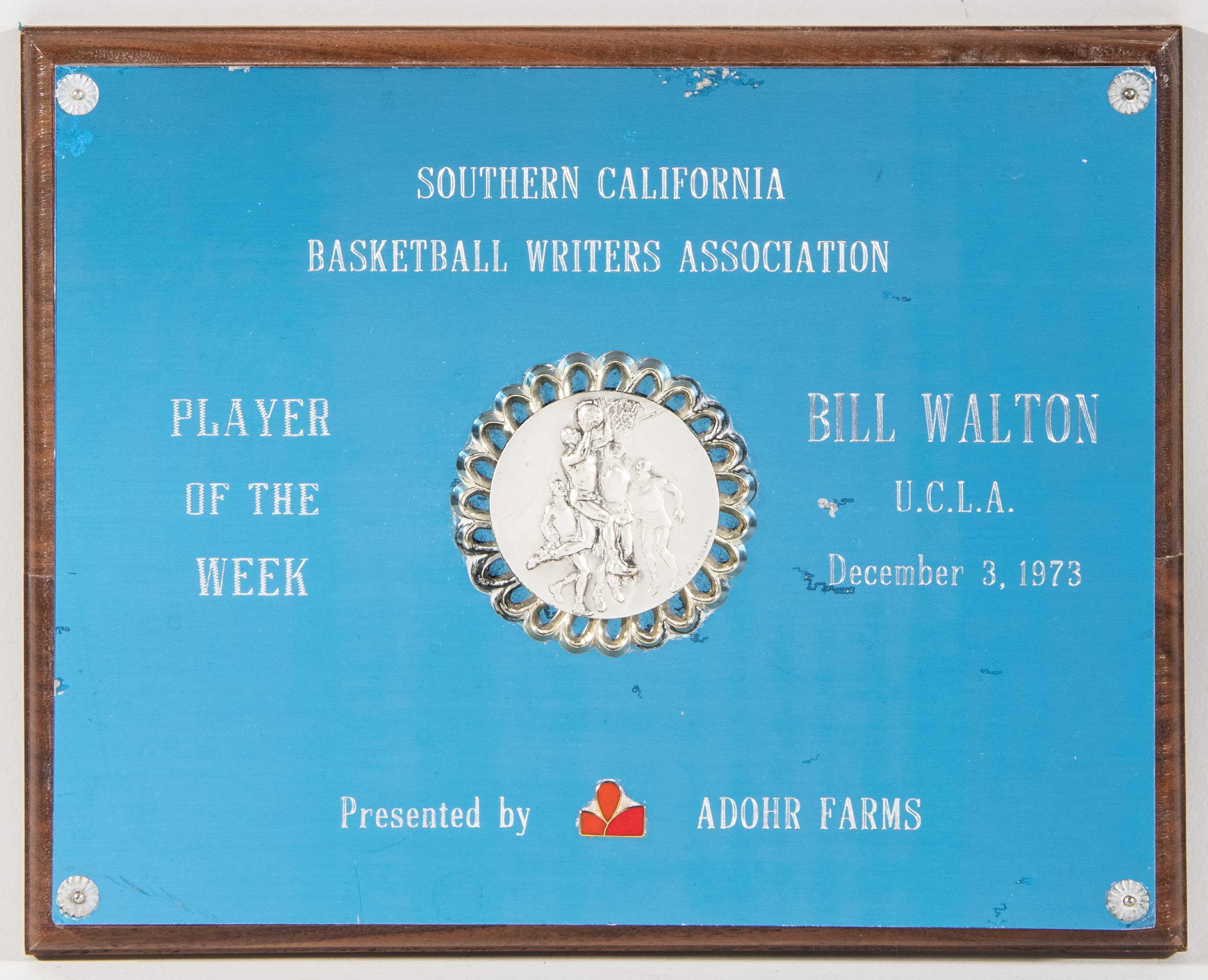 Description:Bill Walton's 12/3/1973 Player Of The Week award plaque (EX). 8"x10" plaque awarded to Walton by the Southern California Basketball Writers Association. A few scattered surface scratches to the blue finish. Includes certificate of provenance from Walton Family: EX