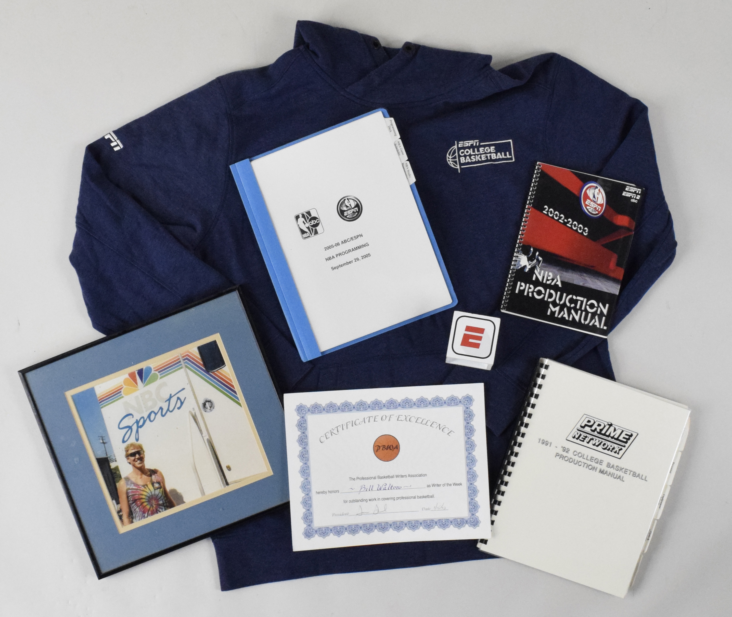 Description:Large lot of broadcasting related memorabilia & paperwork, and books from the Walton collection (VG-NM/MT). Includes (25) mostly basketball books (a few non-basketball) mainly from the 1970s-90s, 2003 Certificate Of Excellence given to Bill Walton by the Professional Basketball Writers Association as "Writer of the Week for outstanding work in covering professional basketball", New Era size XL ESPN College Basketball hoody, ESPN microphone cover, and 19-gallon tub approx. half full of paperwork mostly related to Walton's broadcasting career including articles from publications and online, VHS tapes, and correspondence from various networks. Includes certificate of provenance from Walton Family: VG-NM/MT
