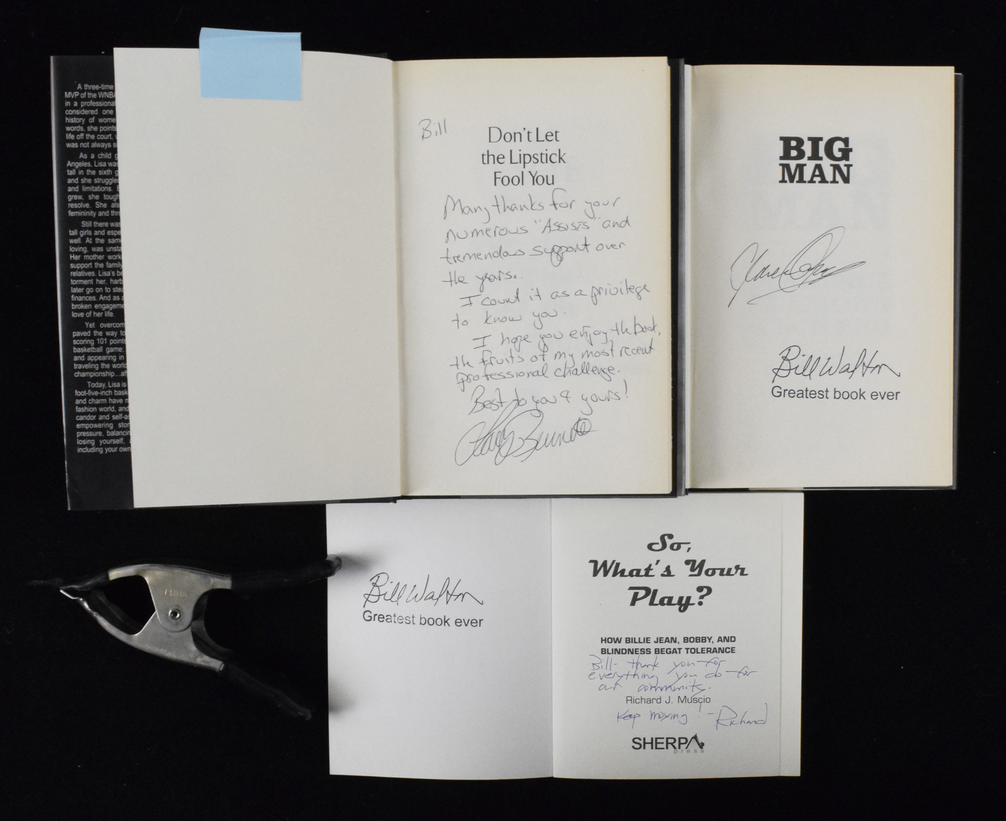 Description:Lot of (10) signed books from the Bill Walton collection (EX-NM/MT). Includes (2) 1979 "Tricked the Hell out of Monday!" signed by Isaac Morris (both personalized); 2002 "The Far Out Story of Vortex I" signed by Matt Love; 2008 "Lisa Leslie: Don't Let the Lipstick Fool You" signed by Larry Burnett (personalized); 2009 "Big Man" signed by Clarence Clemons; 2011 "Empty Nest Egg" signed by Terry Noel (personalized); 2012 "The Secret Of Nexus" signed by Jeff Miller; 2013 "So, What's Your Play?" signed by Richard Muscio (personalized); 2021 "Ted Talks" signed by Ted Leitner (personalized); and 2022 "Levon Helm: Rock-Roll-Ramble" signed by John Barry (personalized). Signatures rate 8 to 10 out of 10. Includes certificate of provenance from Walton Family: EX-NM/MT