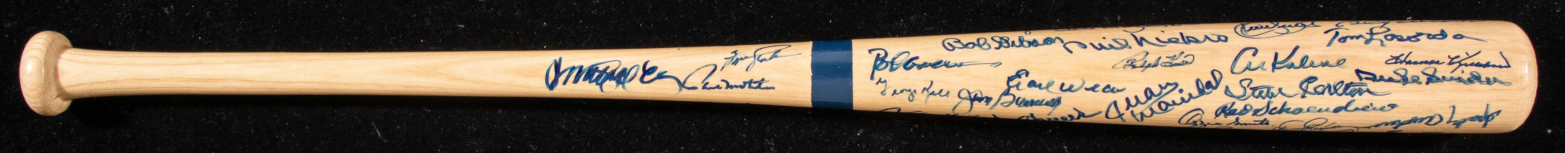 Description:Hall Of Famers multi-signed baseball bat from the Willie Mays collection with (45) autographs - JSA (NM). 34" Rawlings-Adirondack HOF logo bat signed by Willie Mays, Gary Carter, Ryne Sandberg, Phil Niekro, Ralph Kiner, Tom Seaver, Bob Feller, Robin Roberts, Harmon Killebrew, Duke Snider, Kirby Puckett, Al Kaline, Bob Doerr, Yogi Berra, Whitey Ford, Gaylord Perry, Bob Gibson, Monte Irvin, Brooks Robinson, George Kell, Red Schoendienst, Don Sutton, Lou Brock, Orlando Cepeda, Sandy Koufax, Wade Boggs, Rod Carew, Carlton Fisk, Dave Winfield, Bill Mazeroski, Johnny Bench, George Brett, Billy Williams, Steve Carlton, Eddie Murray, Ozzie Smith, Paul Molitor, Juan Marichal, Tony Perez, Fergie Jenkins, Rollie Fingers, Dennis Eckersley, Sparky Anderson, Tom Lasorda, and Earl Weaver. Signatures rate 7/8 to 10 (avg 8/9) out of 10. Includes a previous auction LOA from JSA and Willie Mays Collection certificate of provenance: NM ($1,500-$3,000)