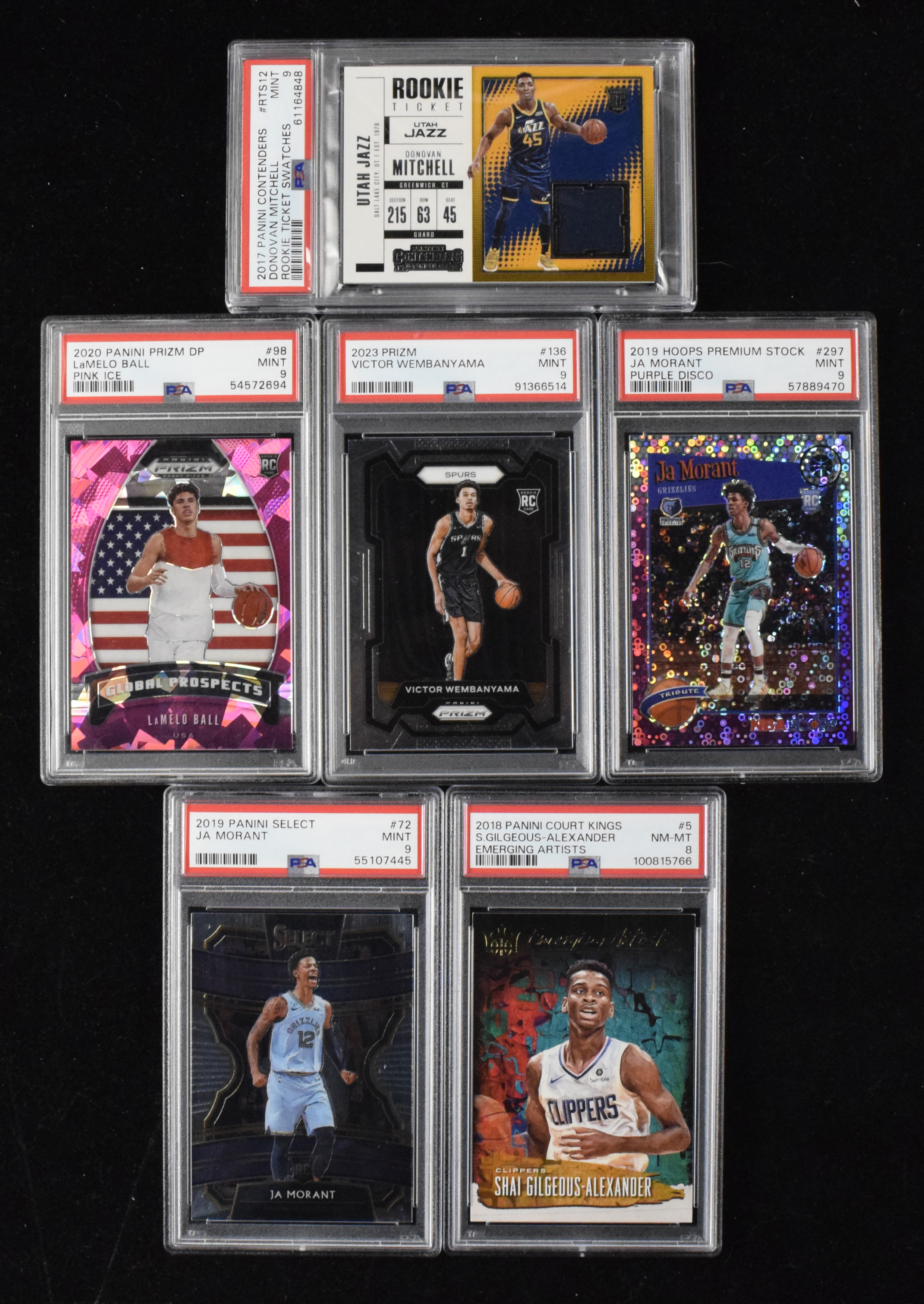 Lot of (8) graded modern basketball star rookie cards (EX/MT-MT). Includes 2015-16 Panini Prestige #221 Devin Booker (PSA 6 EX/MT), 2017-18 Panini Contenders "Rookie Ticket Swatches" #RTS-12 Donovan Mitchell (PSA 9 MT), 2018-19 Panini Court Kings "Emerging Artists" #5 Shai Gilgeous-Alexander (PSA 8 NM/MT), 2019-20 NBA Hoops Premium Stock "Prizms Purple Disco" #297 Ja Morant (PSA 9 MT), 2019-20 Panini Select #72 Morant (PSA 9 MT), 2020 Panini Prizm Draft Picks "Pink Ice" #98 LaMelo Ball (PSA 9 MT), 2020-21 Panini Chronicles #103 Tyrese Haliburton (PSA 6 EX/MT), and 2023-24 Panini Prizm #136 Victor Wembanyama (PSA 9 MT).