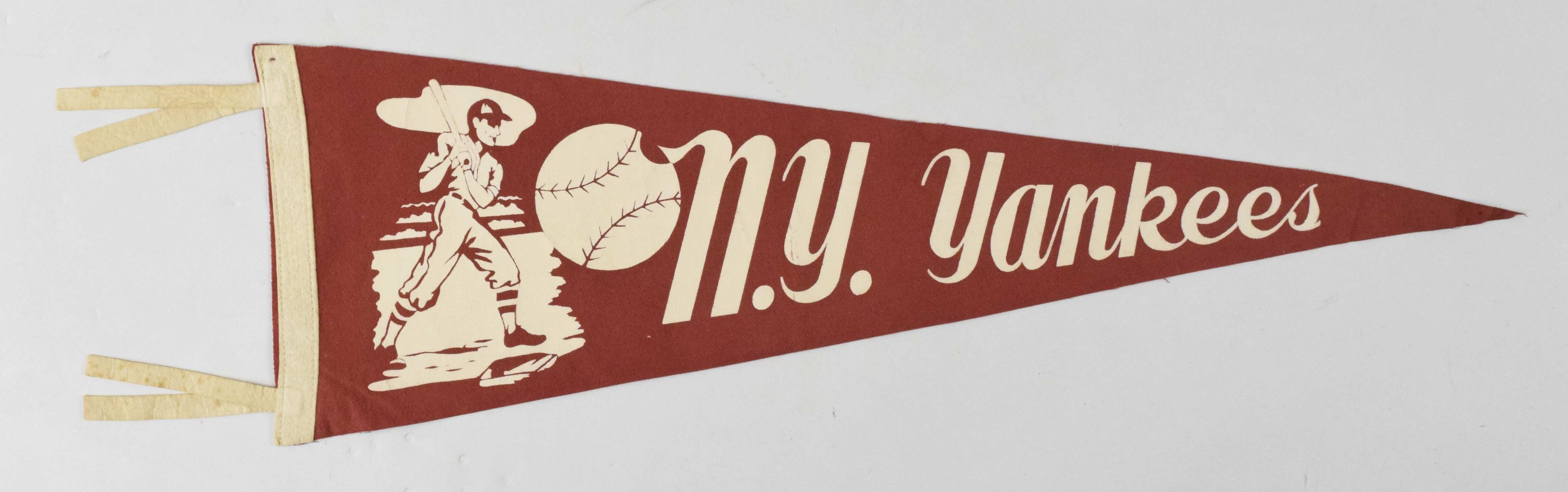 Description:New York Yankees vintage pennant, c.1940s (VG/EX-EX). Rare 26" red pennant with batter graphic at the left side. Age toning spots on the tassels, and minor tack holes: VG/EX-EX