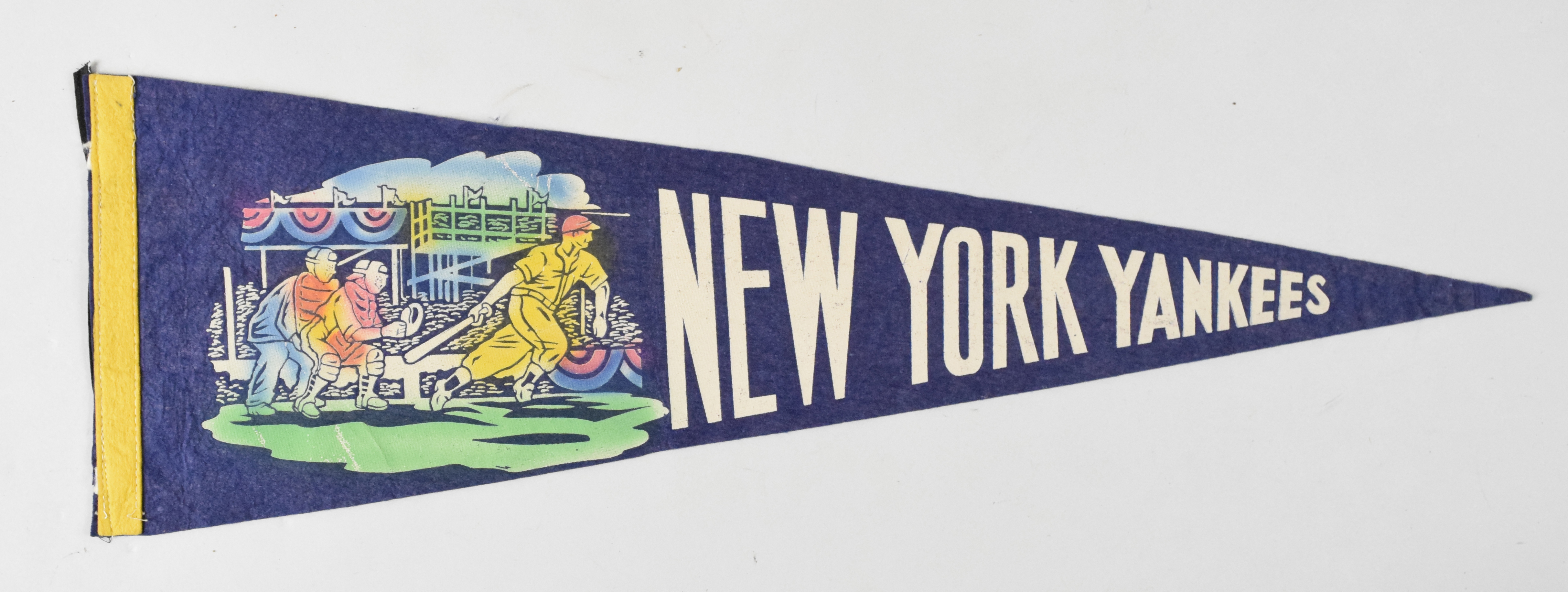 Description:Very rare New York Yankees pennant, c.1930s (VG/EX). 26" blue Yankees pennant with colorful game action graphic at the left side. Clipped tassels, along with a strip of black fabric added along the left edge likeky for hanging purposes: VG/EX