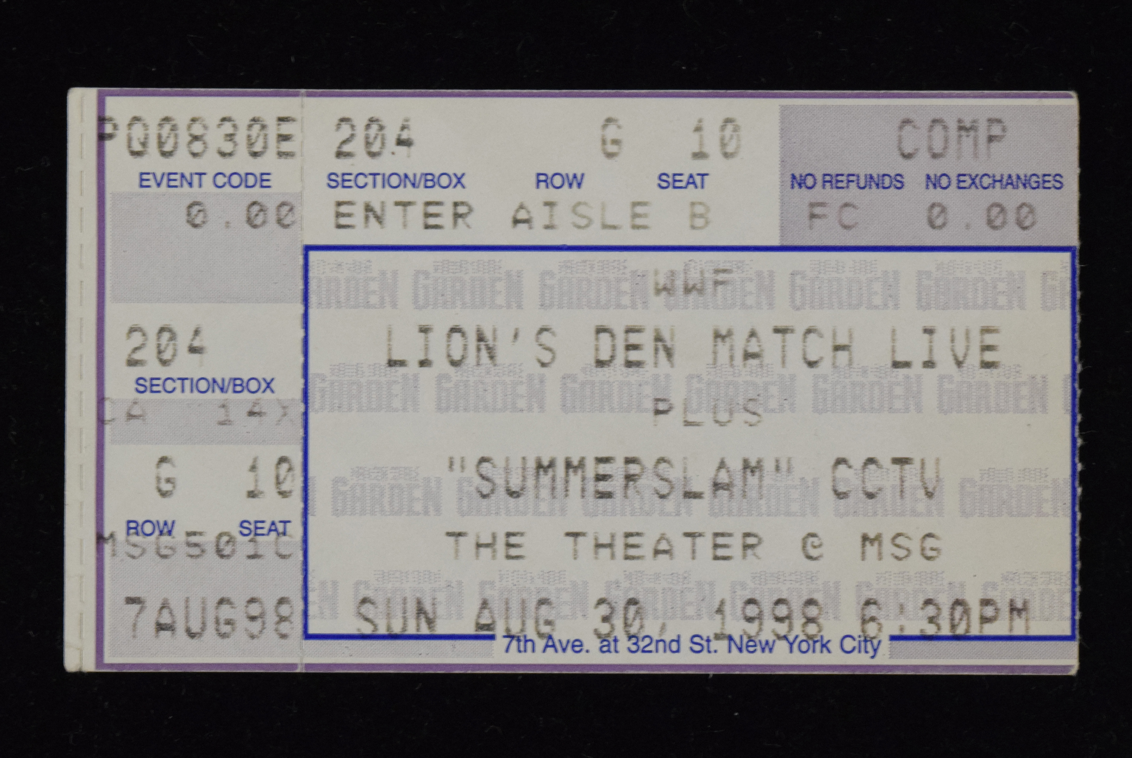 Description:Rare 1998 WWF SummerSlam ticket stub - scarcer on-site Lion's Den match version (EX/MT-NM). 8/30/1998 Madison Square Garden ticket stub from a card full of noteworthy matches including Stone Cold Steve Austin defeating The Undertaker for the WWF Championship, Triple H defeating The Rock in a ladder match to win the Intercontinental Championship, The New Age Outlaws defeating Mankind in a handicap match to win the Tag Team Championship, and other matches including The Lion's Den match (Ken Shamrock defeats Owen Hart) which took place in front of a special crowd in a separate theatre within Madison Square Garden which also showed the other SummerSlam matches. This ticket stub is from that select crowd. Minimal wear: EX/MT-NM