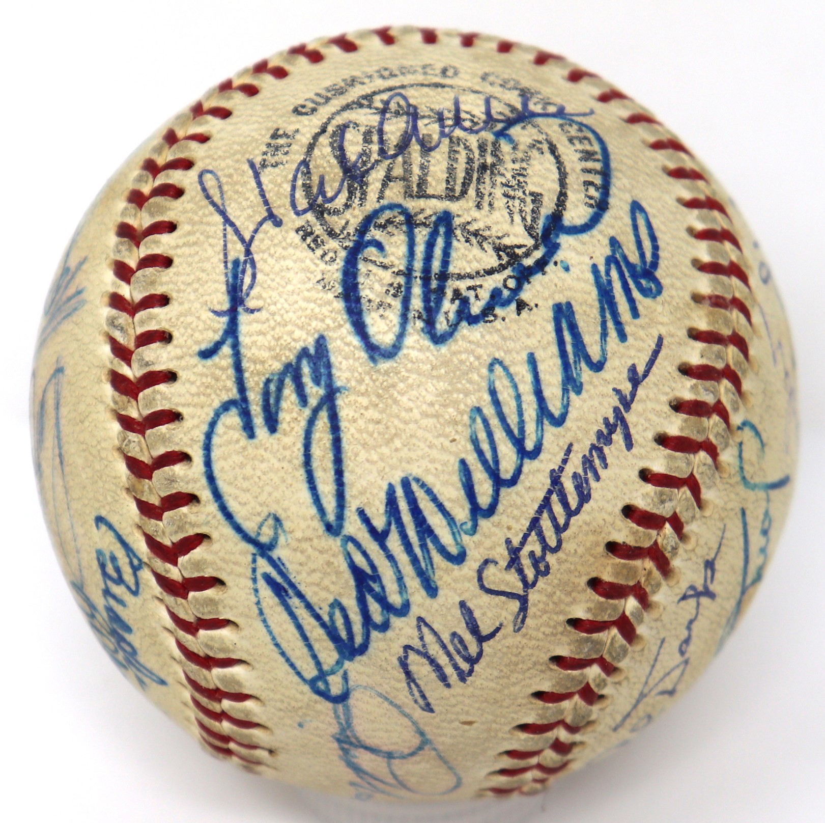 Description:Vintage stars & Hall Of Famers multi-signed baseball with (21) autographs including Williams & Mantle, c.1960s (EX). W.Giles National League ball signed by (21) including Mickey Mantle, Ted Williams, Hank Aaron, Willie Mays, Ralph Kiner, Sandy Koufax, Brooks Robinson, Duke Snider (faded), Lou Brock, Eddie Mathews, Warren Spahn, Whitey Ford, Tony Oliva, Mel Stottlemyre, Al Dark, Johnny Podres, Tony Taylor, Jerry Koosman (signed "Kooz"), and others. Signatures rate 5/6 (Snider) to 9/10 (avg 8) out of 10. The ball appears used (but not extreme) with surface soiling: EX ($750-$1,500)