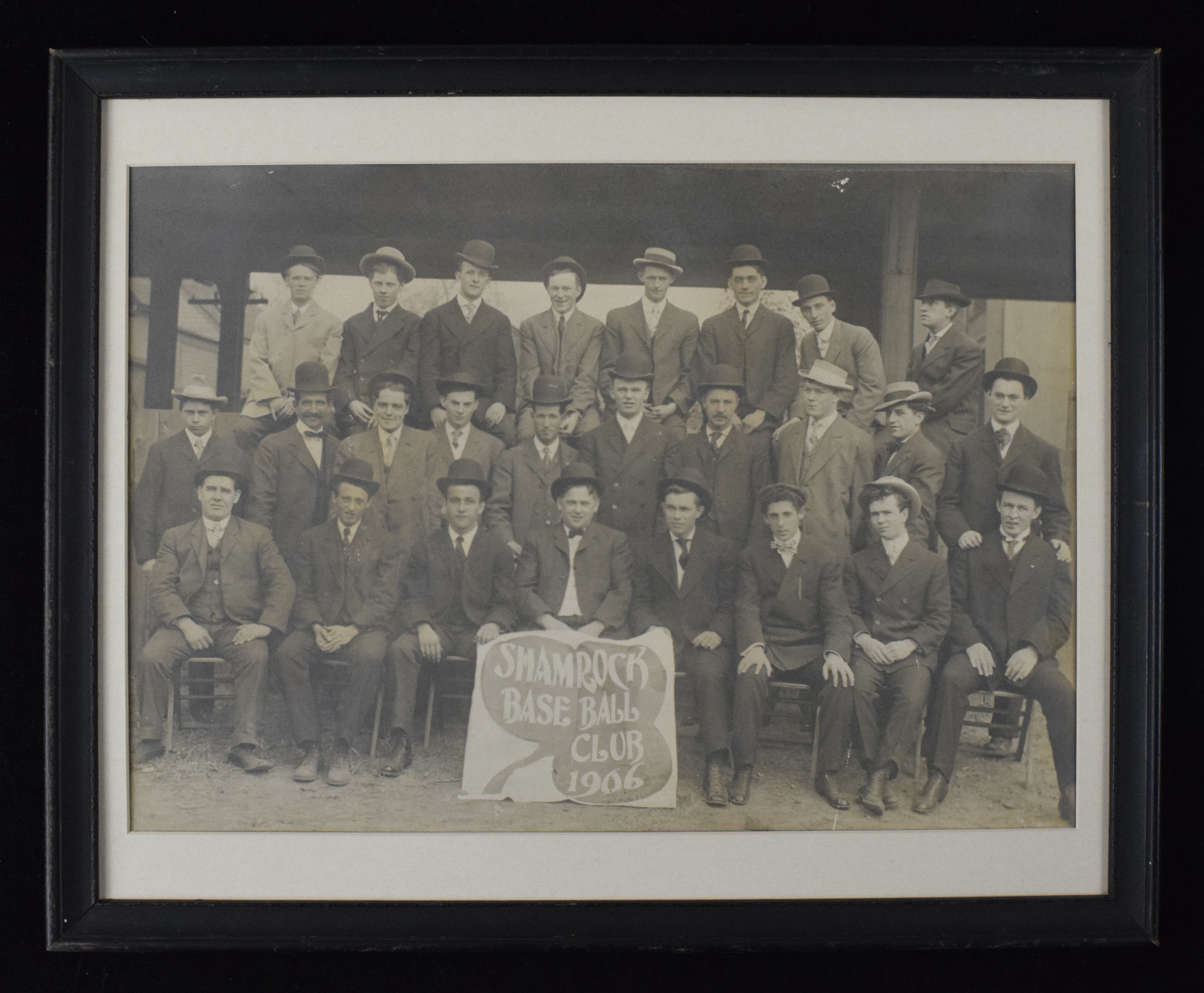 Description:1906 Shamrock Base Ball Club team photograph (EX framed). Frame measures approx. 17.5"x21.5". High quality vintage photo pictures team members dressed in suits with logo sign sign sitting in front. Due to framing, condition of back and edges unknown, but a few small spots of surface wear are visible on the front: EX