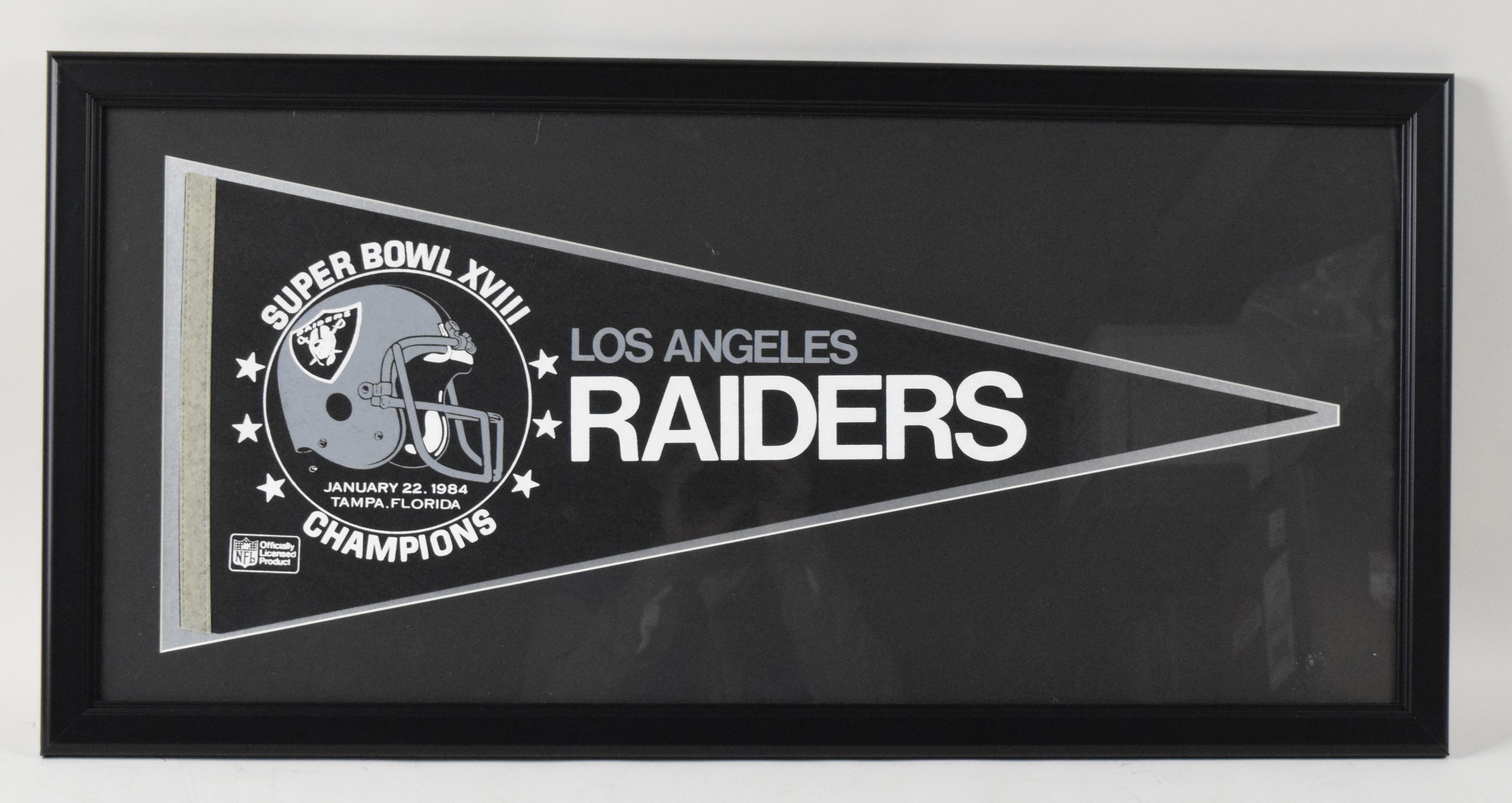 Description:Framed 1984 Los Angeles Raiders Super Bowl XIII Champions pennant (NM). Frame measures approx. 18.5"x37". Due to framing, complete condition is unknown, but minimal wear visible: NM appearance